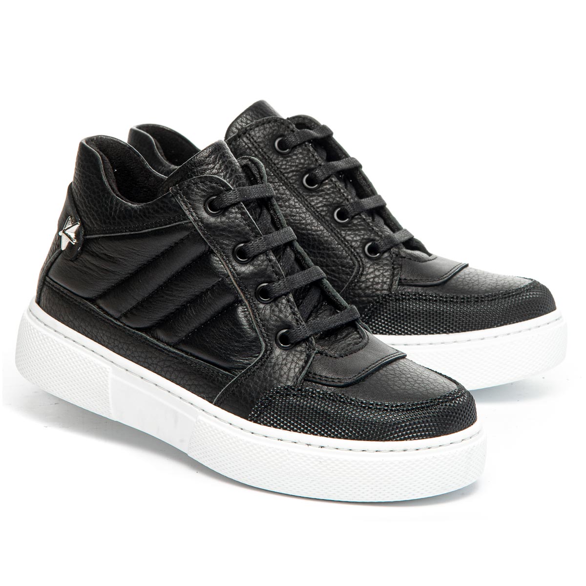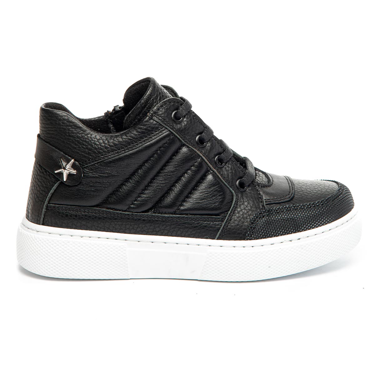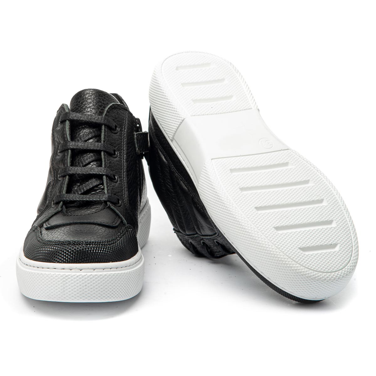 Демісезонні низькі черевики – це ідеальне взуття для перехідних сезонів, виготовлені з натуральної шкіри чорного кольору. Дизайн поєднує класичні шнурки, які дозволяють регулювати посадку, з бічною блискавкою, що сприяє швидкому і зручному взуванню. Контрастна біла підошва додає модного вигляду та забезпечує відмінне зчеплення з поверхнею. Взуття на флісовій підкладці. Устілка шкіряна з анатомічним супінатором. Такі черевики – це стильний акцент у гардеробі вашої дитини, що поєднує зручність та сучасний дизайн.