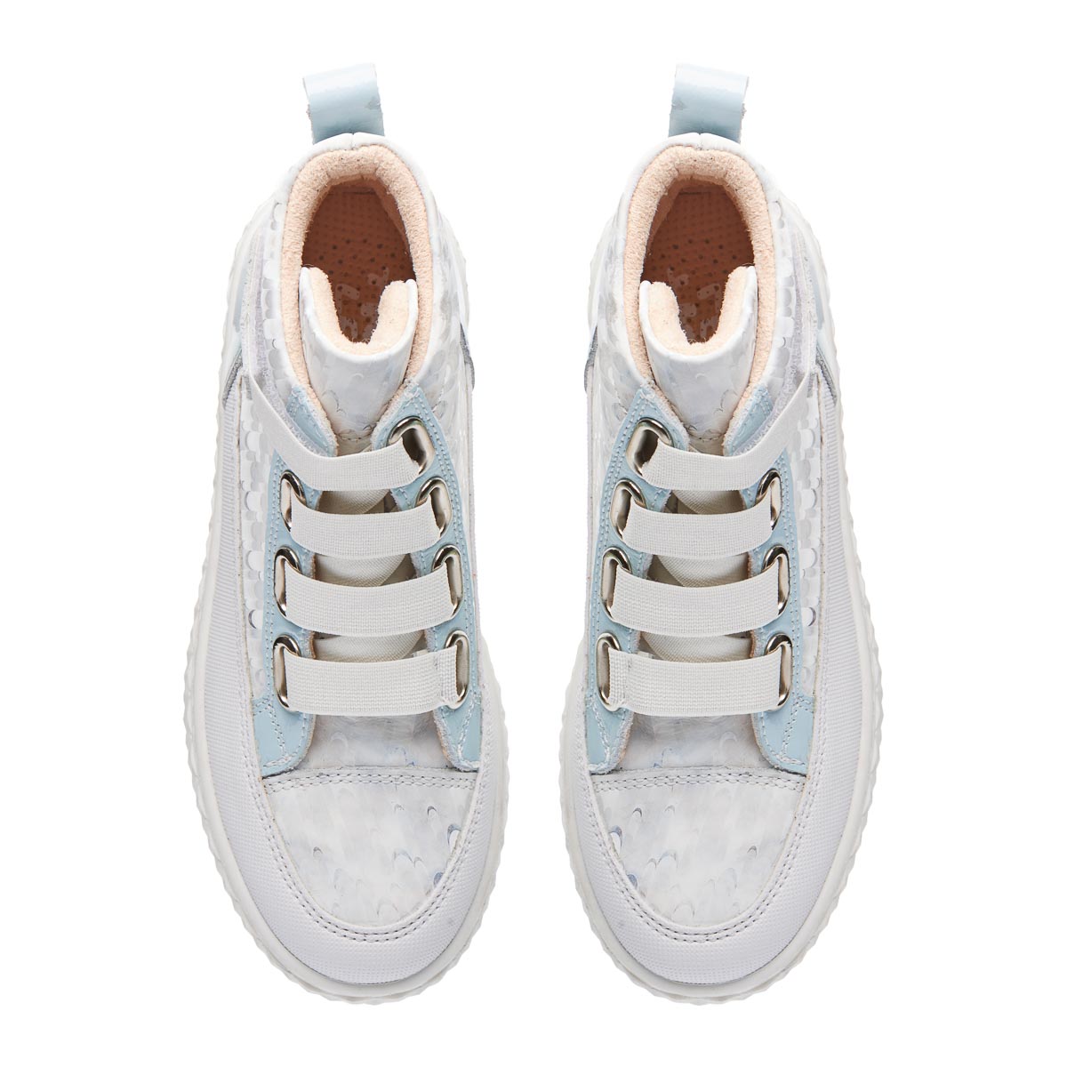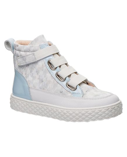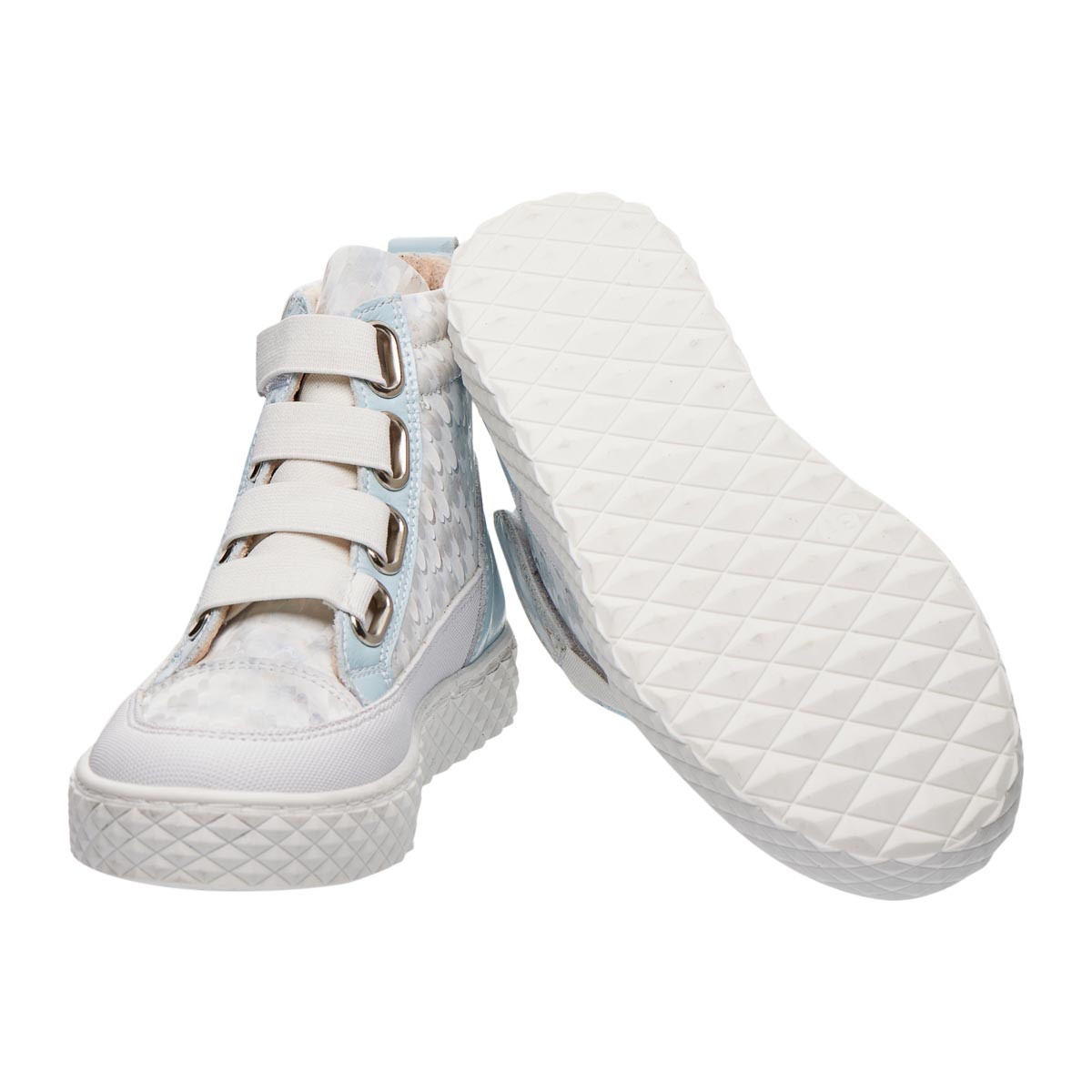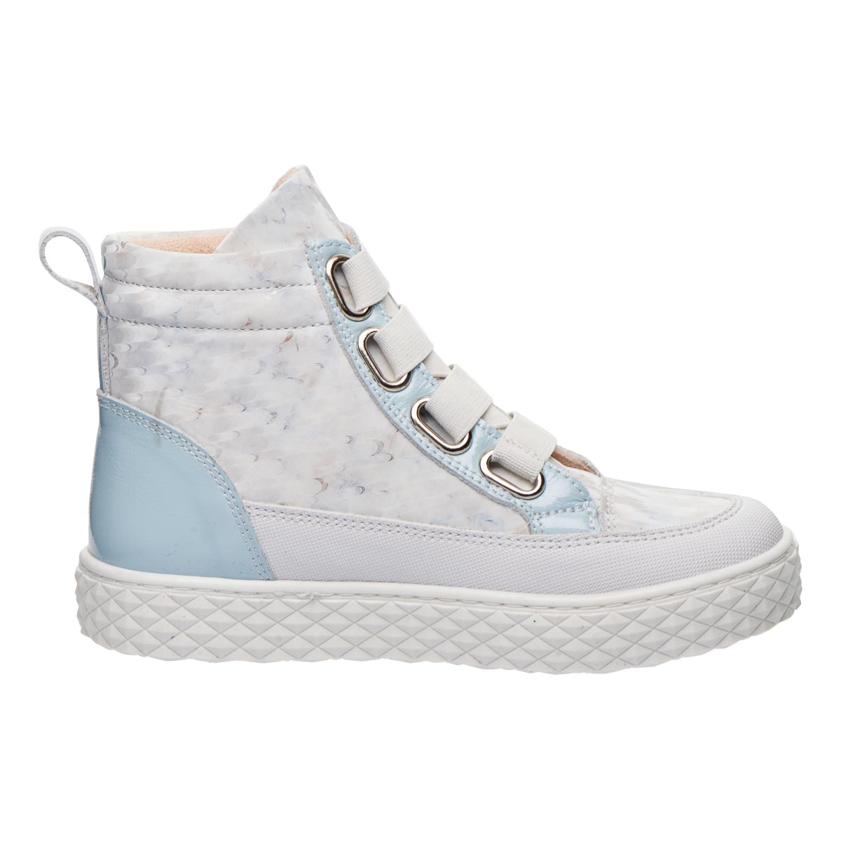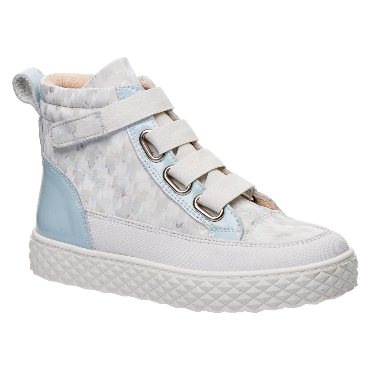 Високі демісезонні кеди для дівчат, виконані з натуральної шкіри, у спортивному стилі, поєднують в собі білий та блакитний кольори. У цих кедах застібка представлена шнурками-гумками, на кінчику шнурівки використовується липучка, яка забезпечує надійну фіксацію на нозі. В якості утеплювача – фліс, м’який на дотик, теплий матеріал,  устілка шкіряна. Підошва з термопластичної гуми. Ця комфортна модель взуття враховує всі необхідні ортопедичні характеристики дитячого взуття, такі як жорсткий задник, ортопедична устілка з анатомічним супінатором. Ці стильні кеди стануть чудовим вибором для активних дівчат, які цінують як комфорт, так і модний вигляд.