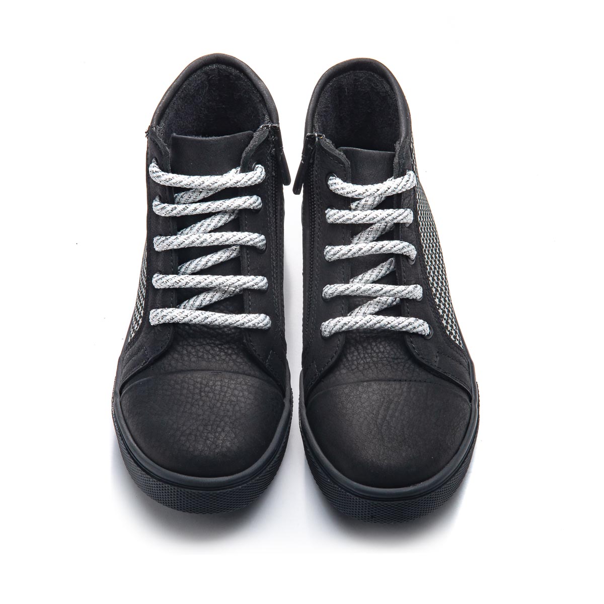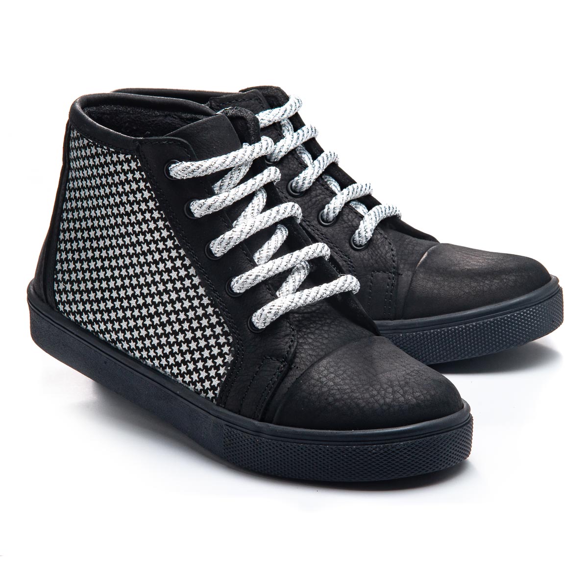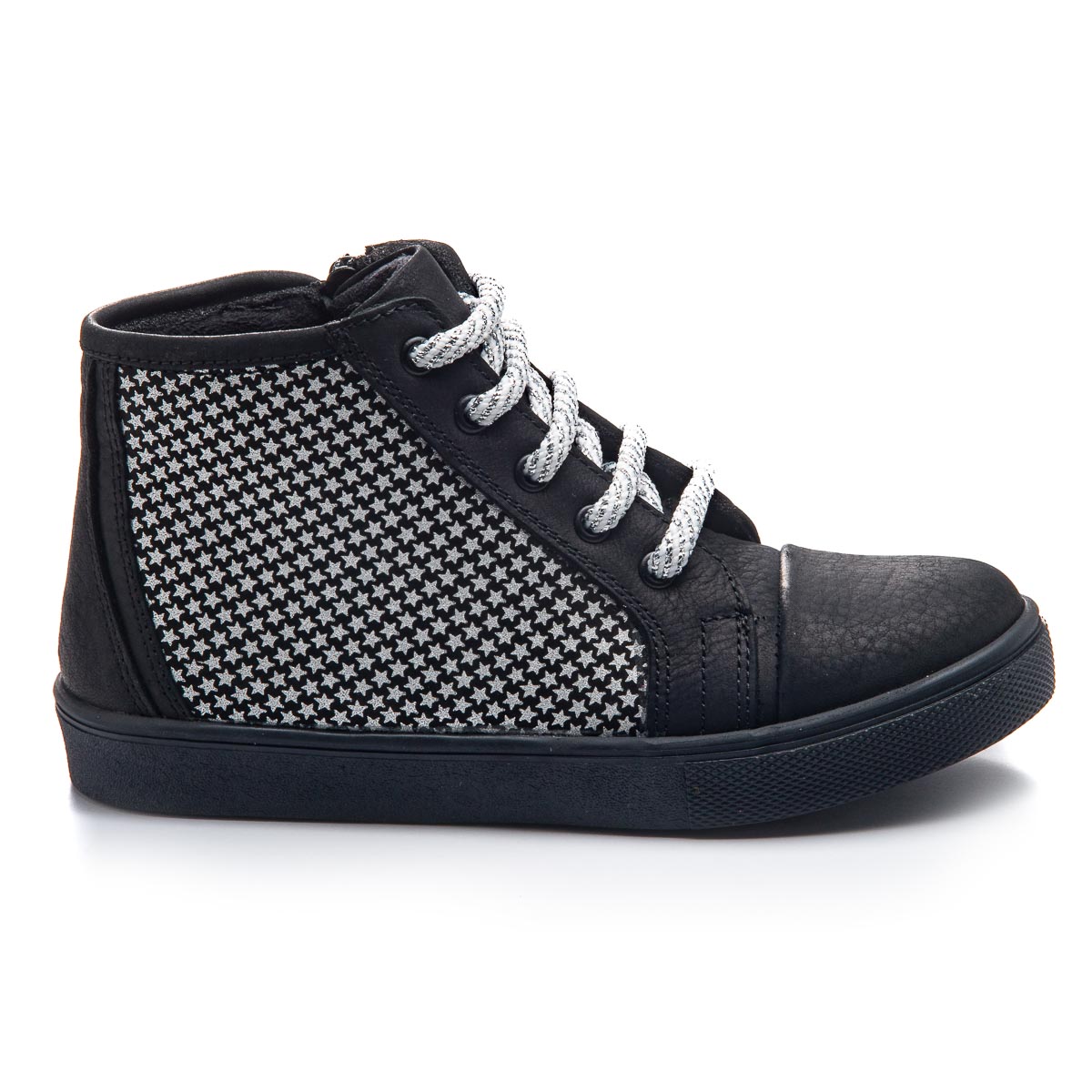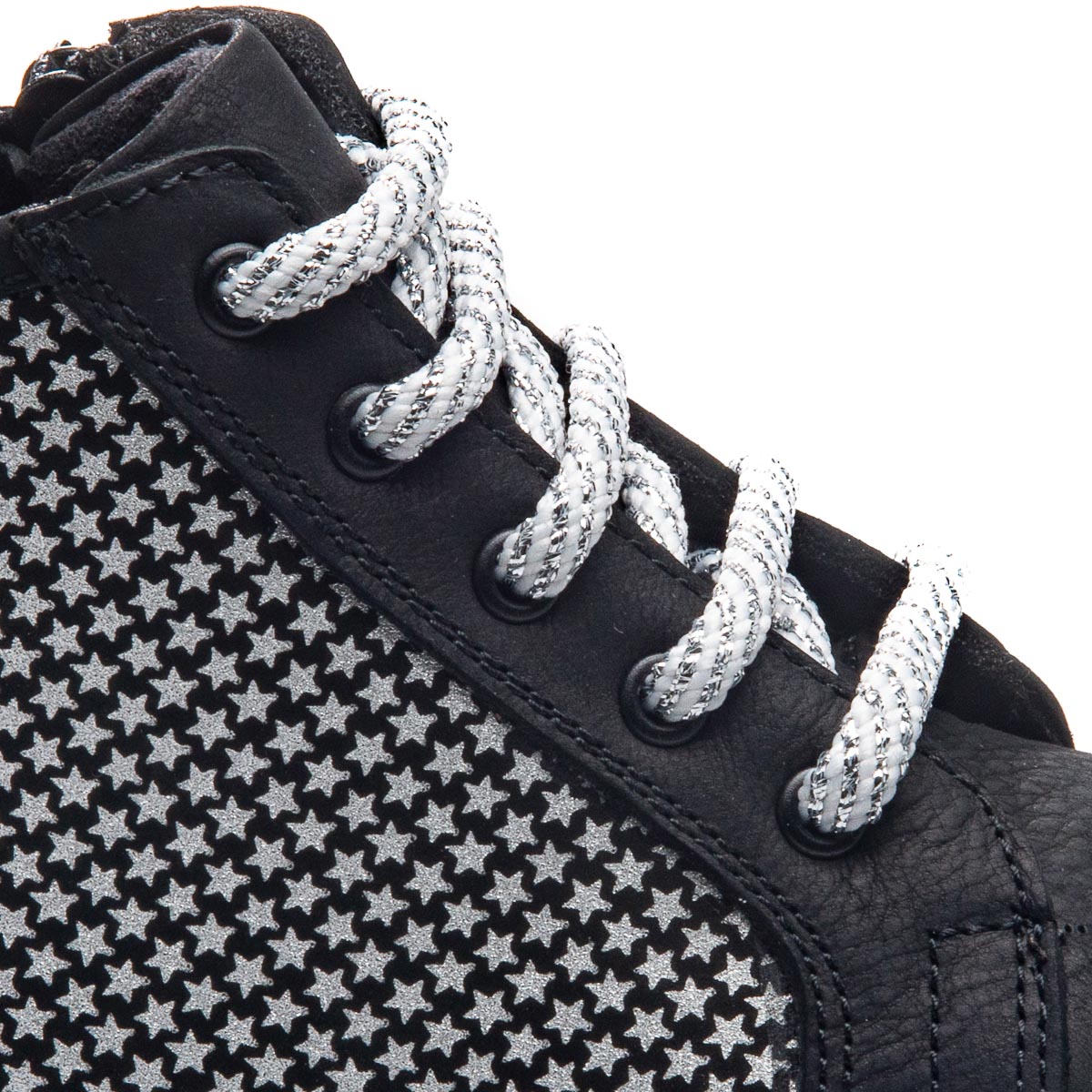 Здивуйте маленьку модницю цими стильними демісезонними черевиками для дівчинки! Чорна натуральна шкіра, зірковий срібний принт, анатомічна устілка з супінатором і флісове утеплення – усе для максимального комфорту і тепла. Зручна блискавка та декоративні сріблясті шнурки додають елегантності. Ідеальний вибір для осіннього сезону!