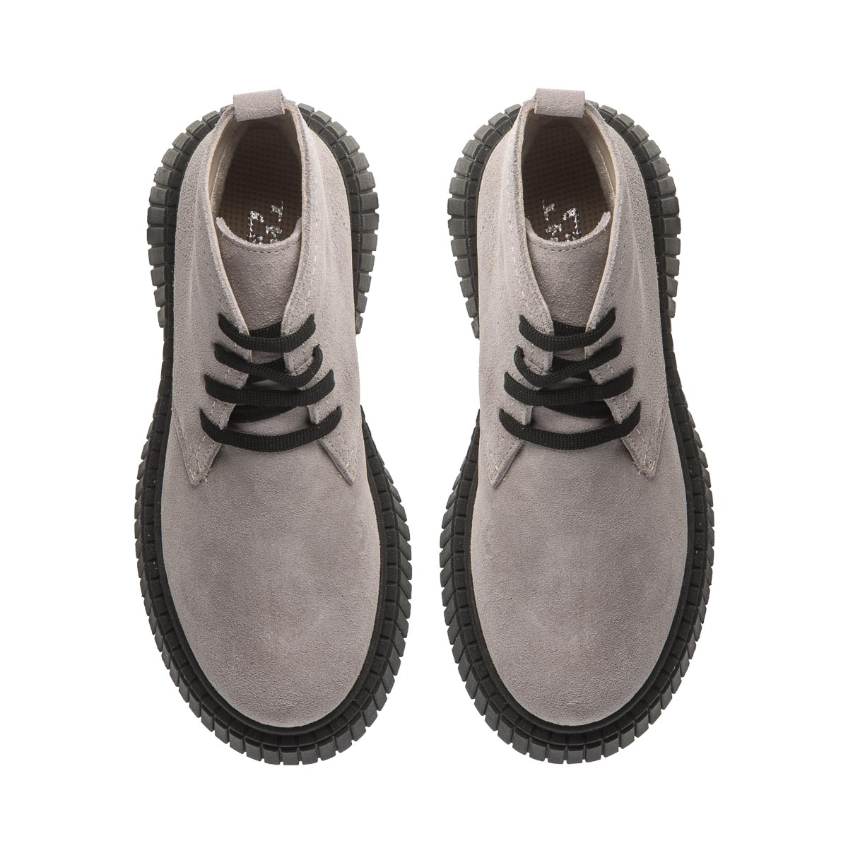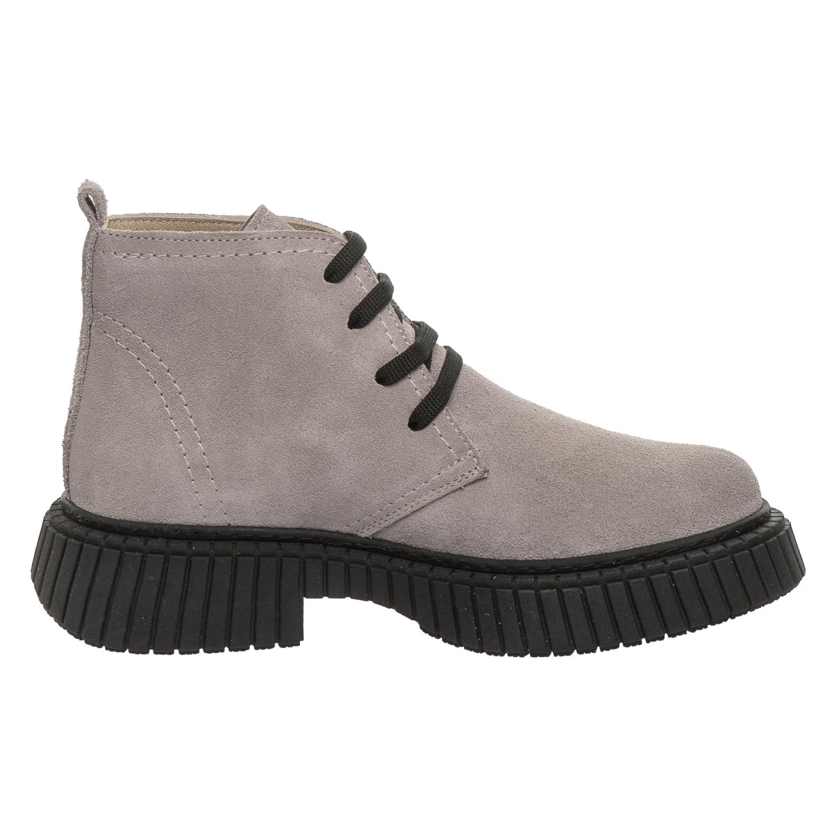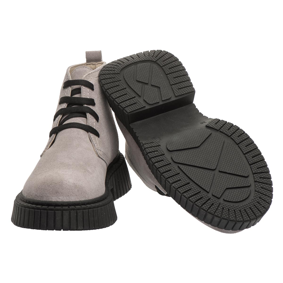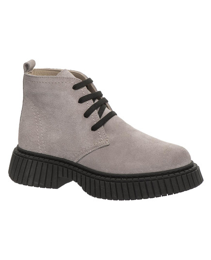 Демісезонні черевики для дівчаток, виготовлені з натурального нубуку світло-сірого кольору, вирізняються стильним дизайном і практичністю. Контрастна висока чорна підошва з рельєфним малюнком додає модного вигляду та забезпечує чудове зчеплення з поверхнею. Для комфорту та здоров’я дитячих ніжок модель оснащена твердим задником і анатомічною устілкою з м’яким супінатором анатомічної форми, що підтримує природну форму стопи під час ходьби. Шнурівка дозволяє зручно відрегулювати повноту черевиків і надійно зафіксувати їх на нозі. Підошва з термопластичної гуми — гнучка, зносостійка, з хорошими амортизаційними властивостями та не ковзає.