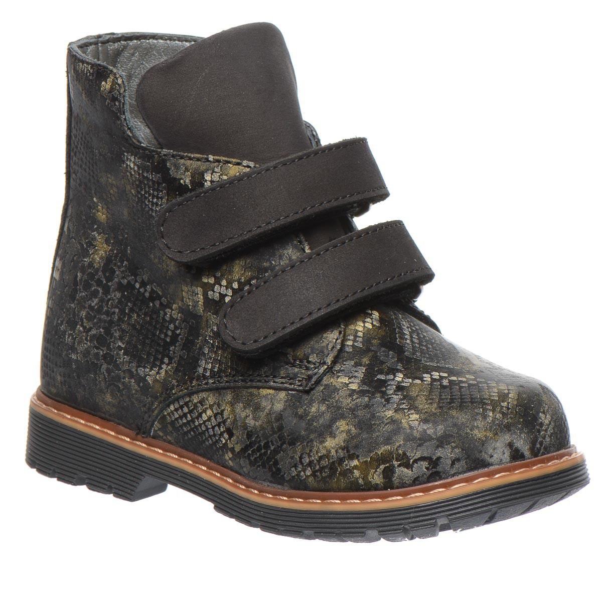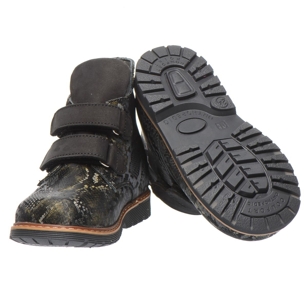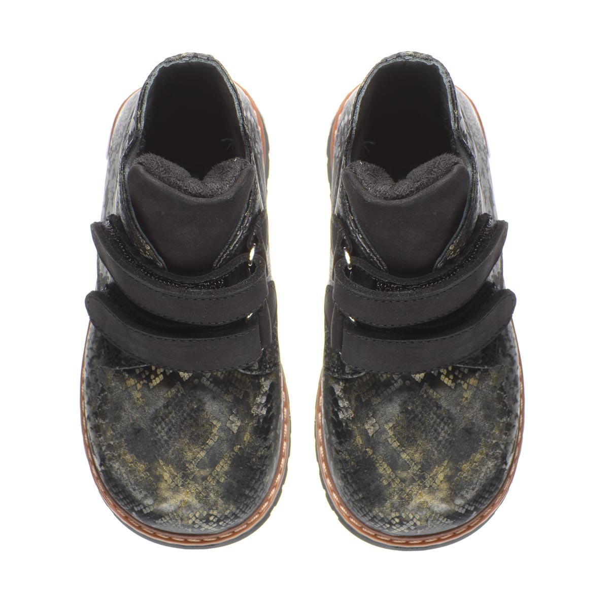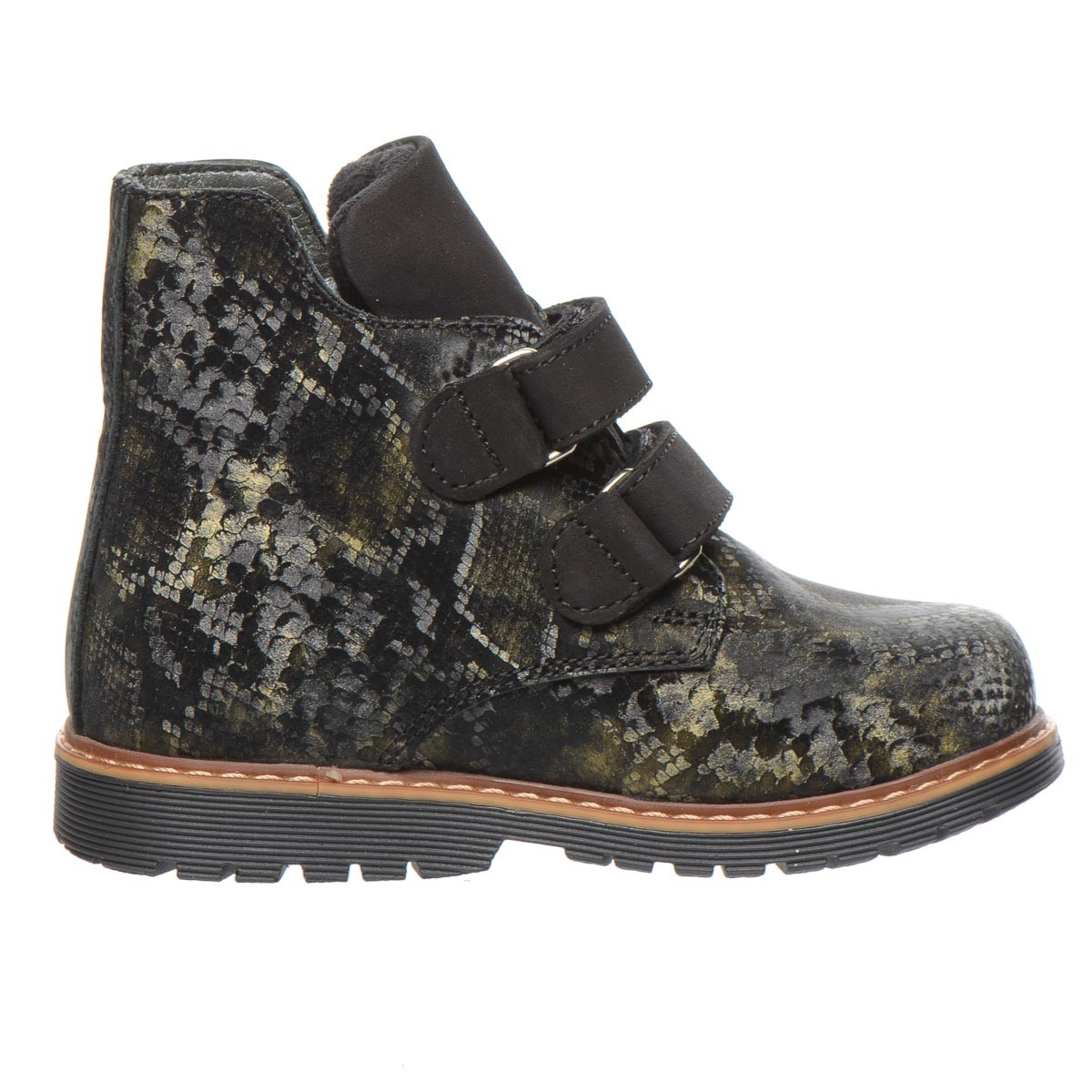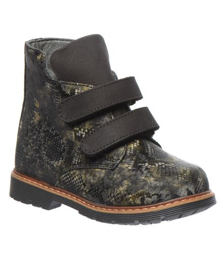 Черевики чорно-зеленого кольору для дівчаток, з натуральної шкіри з малюнком що імітує зміїну шкіру. Утеплені м'яким флісом, ці черевики гарантують комфорт і тепло навіть у найхолодніші дні. Особливо варто відзначити ортопедичні елементи, що роблять ці черевики ідеальними для здорового розвитку ніжок дитини. Вони оснащені каблуком Томаса, супінатором для підтримки склепіння стопи та твердим задником. Ця модель не лише вражає своїм стильним дизайном, але й піклується про здоров'я вашої дитини.