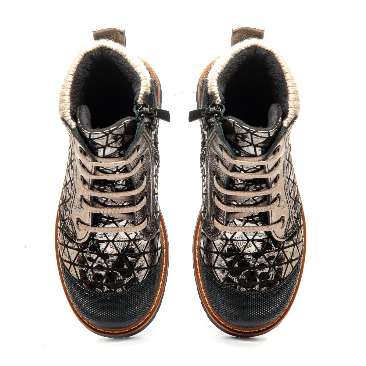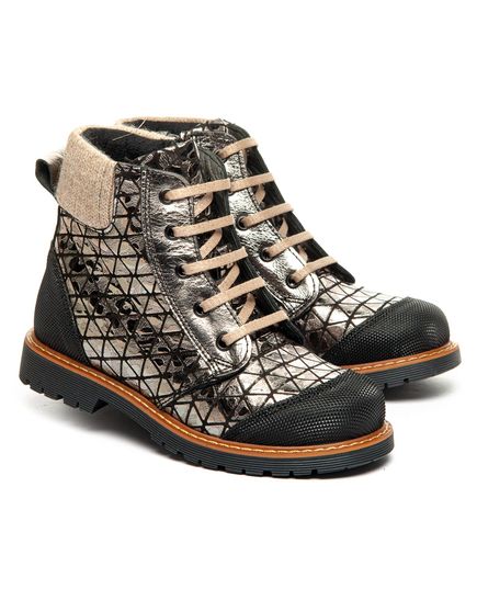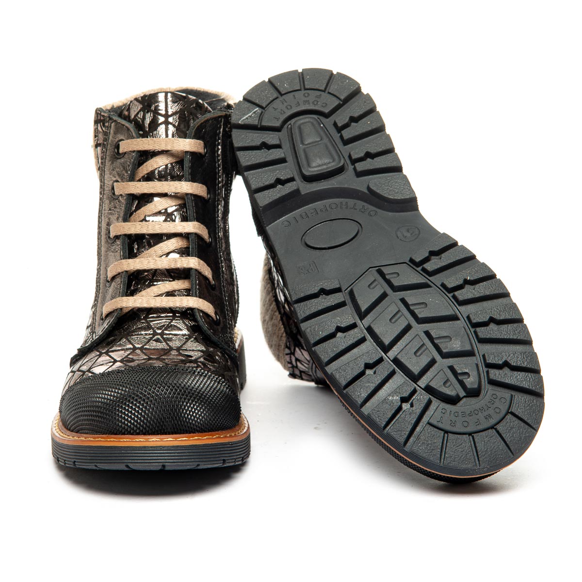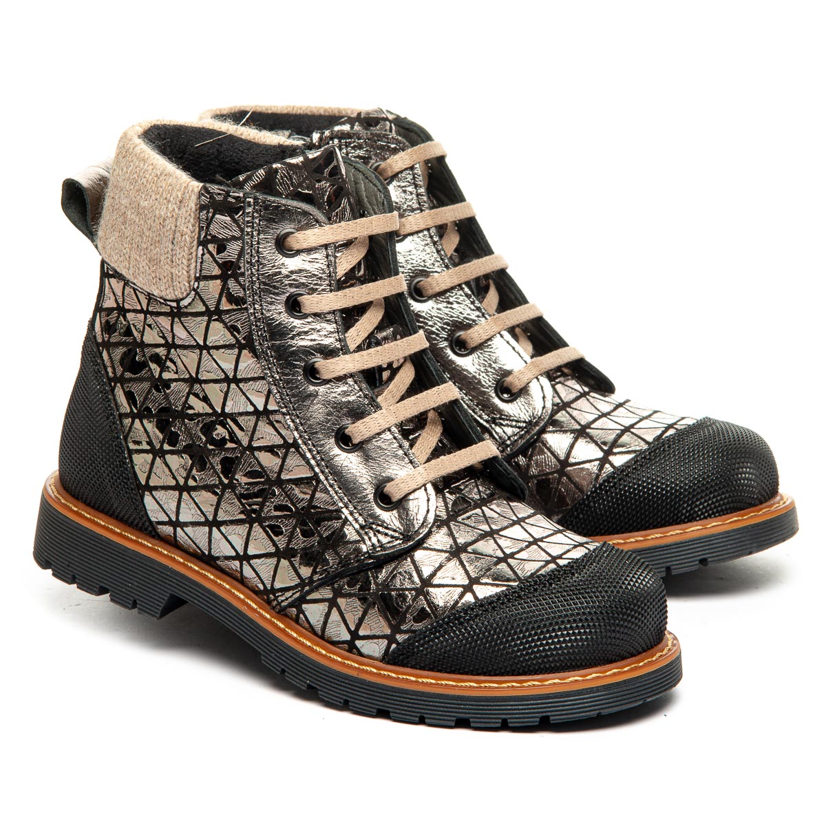 Демісезонні черевики для дівчаток виглядають дуже стильно завдяки золотистому кольору наданому натуральній шкірі. Всередині вони утеплені флісом, а устілка шкіряна. Модель також має контрастні чорні вставки на носочку та п’яті, які не лише підкреслюють стиль, але й забезпечують додатковий захист від пошкоджень, зберігаючи черевики в ідеальному стані на довгий час. Взуття оснащене шнурівкою та блискавкою з бокової сторони. Ортопедичні характеристики цього взуття включають жорсткий задник, ортопедичну устілку з супінатором та каблук Томаса. Ці елементи сприяють здоровому розвитку стопи, запобігаючи деформаціям і забезпечуючи комфорт протягом усього дня.