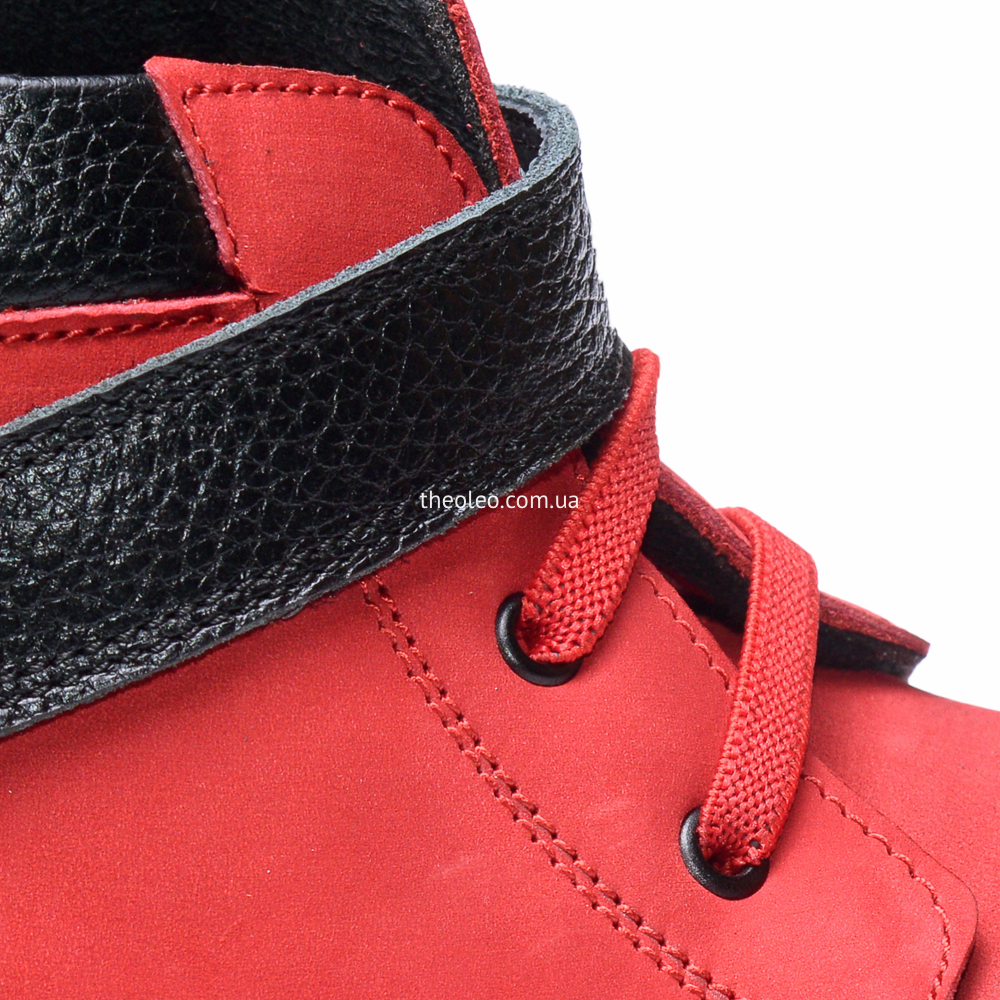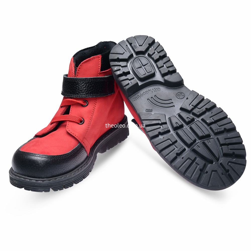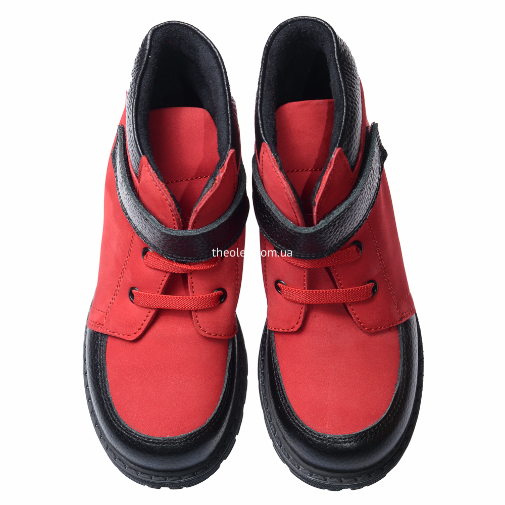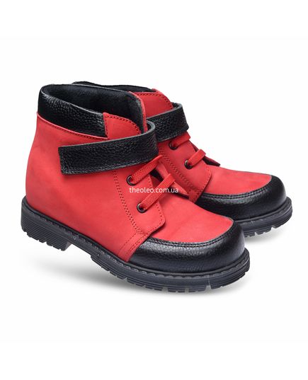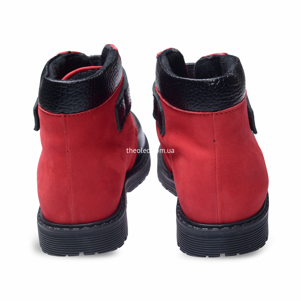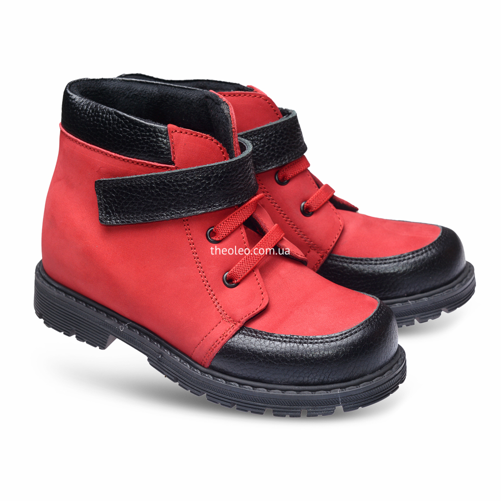 Яскраві і прикольні черевики для дівчинки виконані з натурального нубукучервоного кольору і доповнені вставками з натуральної чорної шкіри. Замістьшнурків для додаткової фіксації використана гумка і липучка. Устілка занатомічним супінатором виготовлена з натуральної шкіри, а підкладка -«осіння», утеплена, з флісу. П'ятка - жорстка. Підошва з каблуком Томаса зтермопластикової гуми, не ковзає і добре амортизує.