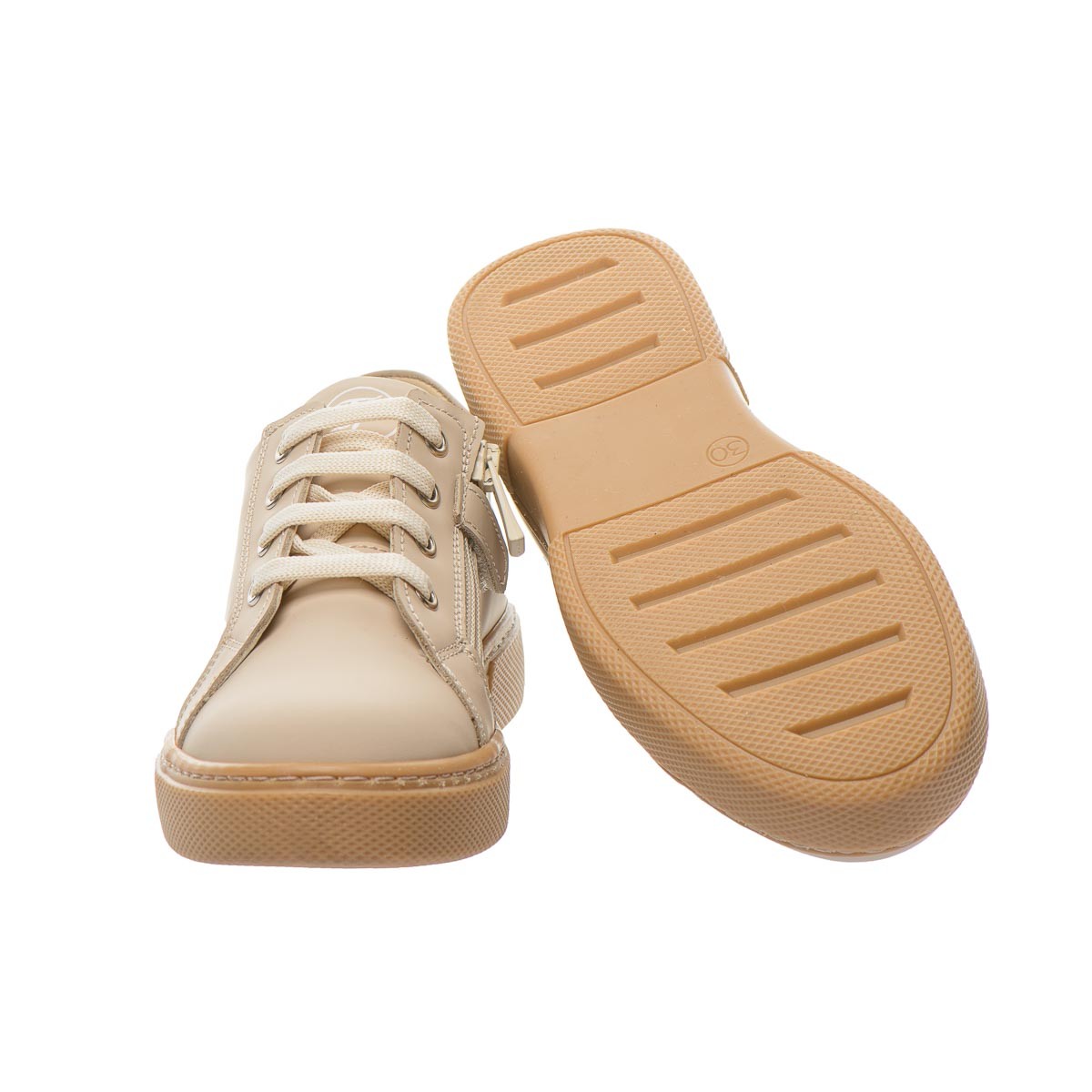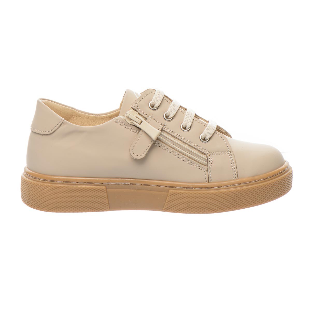 Ці елегантні кеди ідеально підійдуть дівчатам, які цінують комфорт і стиль у своєму повсякденному гардеробі. Виконані з натуральної шкіри бежевого кольору. Для надійної фіксації на нозі використовуються шнурки, а для легкості зняття - блискавка. Модель має анатомічний супінатор для правильної підтримки стопи. Підошва – з термопластичної гуми. Є універсальними і легко поєднуються з різними стилями одягу.