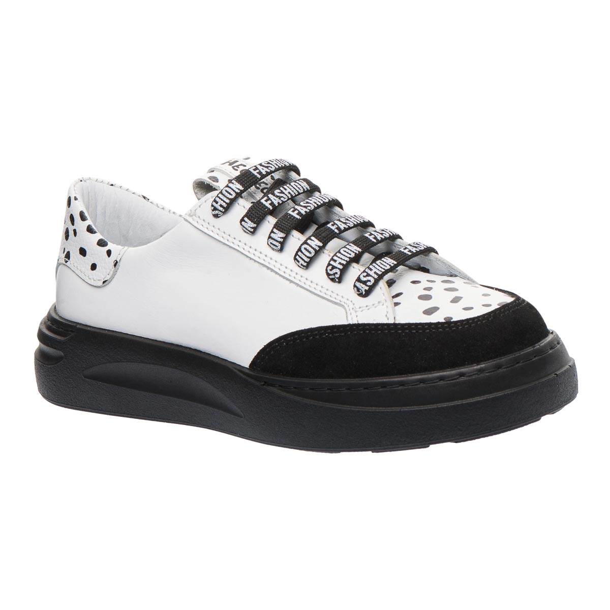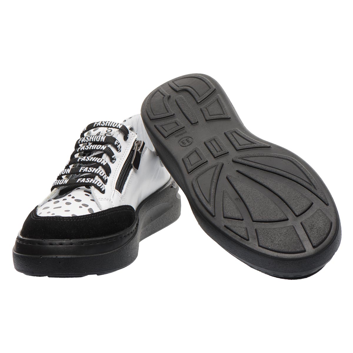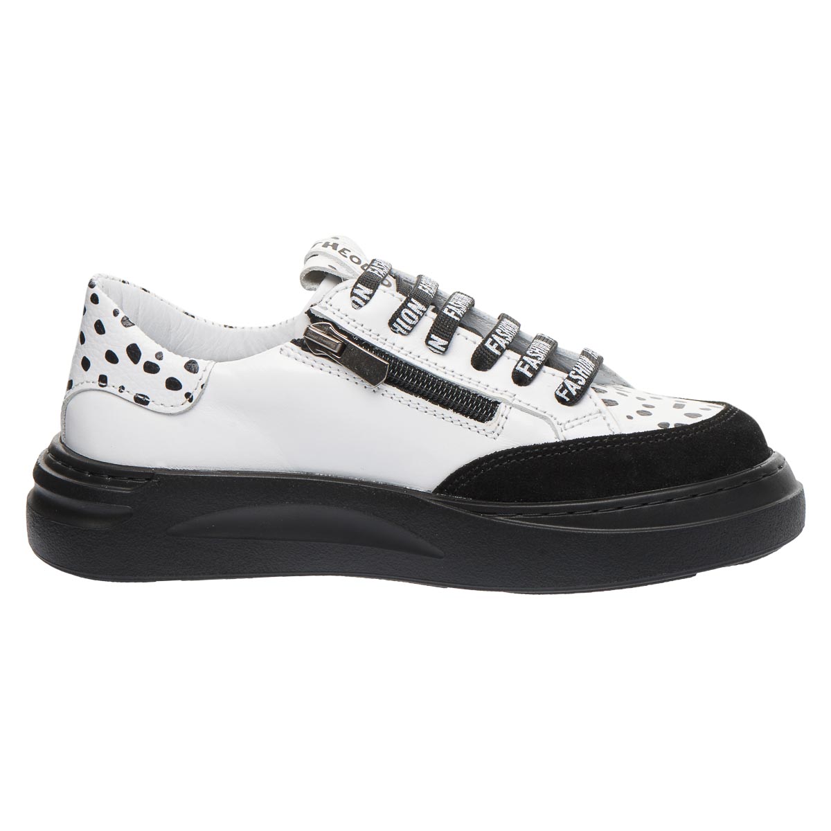 Цікаві та стильні. Ці кеди з незвичайним дизайном у формі чорних цяток точно відрізнять вас від інших. Виконані з натуральної шкіри. Для надійної фіксації на нозі використовуються шнурки, а для легкості зняття - блискавка. Модель має анатомічний супінатор для правильної підтримки стопи, та зручну підошву - виготовлену з термопластичної гуми. Додайте трохи стилю до свого гардеробу!