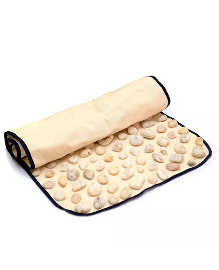Килимок-масажер «Натуральна галька» (60×40 см) виготовлений із натуральної чорноморської гальки, що максимально відтворює відчуття ходьби босоніж по природній поверхні. Основа виконана з міцної лляної тканини. Використаний клей безпечний, нетоксичний, не має запаху та забезпечує надійну фіксацію камінчиків.