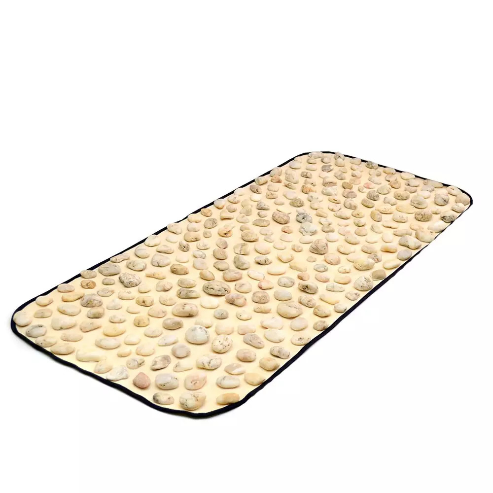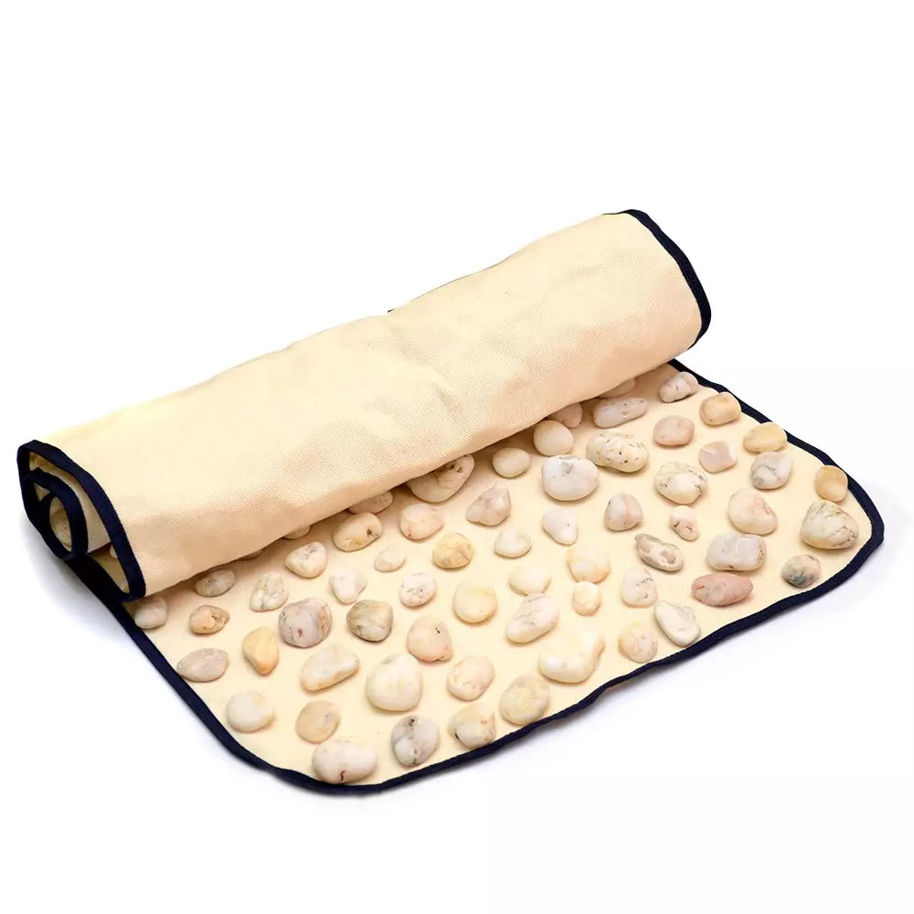 Килимок-масажер «Натуральна галька» (90×40 см) виготовлений із натуральної чорноморської гальки, що максимально відтворює відчуття ходьби босоніж по природній поверхні. Основа виконана з міцної лляної тканини. Використаний клей безпечний, нетоксичний, не має запаху та забезпечує надійну фіксацію камінчиків.