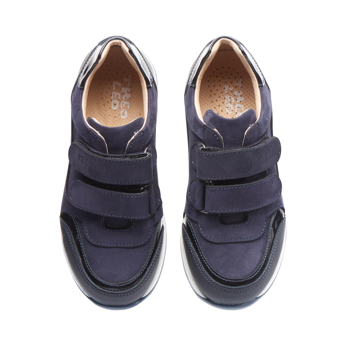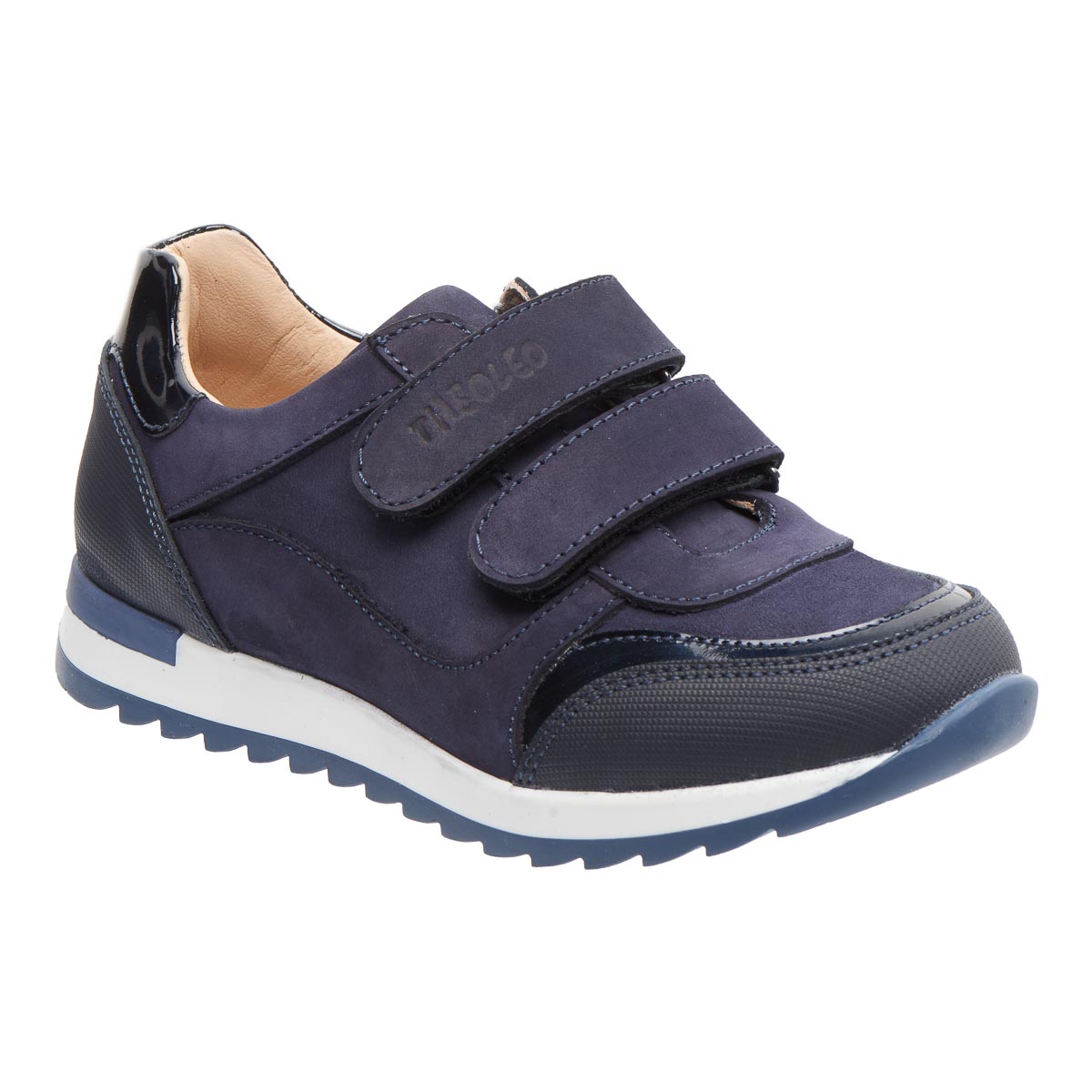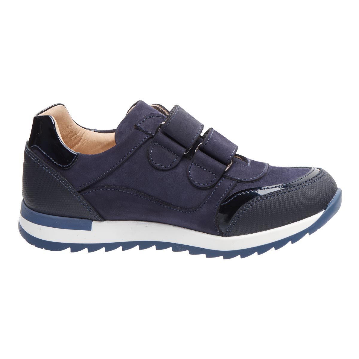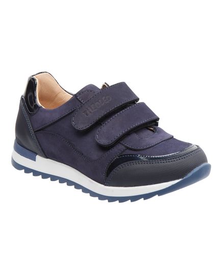 Кросівки для хлопчика виготовлені з натурального нубуку темно-синього кольору, доповнені лакованими вставками, що додає елегантного вигляду. Дві липучки-застібки дозволяють легко надягати та знімати взуття. Кросівки мають гнучкою підошвою для забезпечення природного руху стопи. Ортопедична устілка з анатомічний супінатор підтримує правильне положення стопи, зменшуючи навантаження на суглоби та м'язи. А жорсткий задник надає додаткову підтримку. Кросівки поєднують стильний дизайн з практичністю та комфортом.
