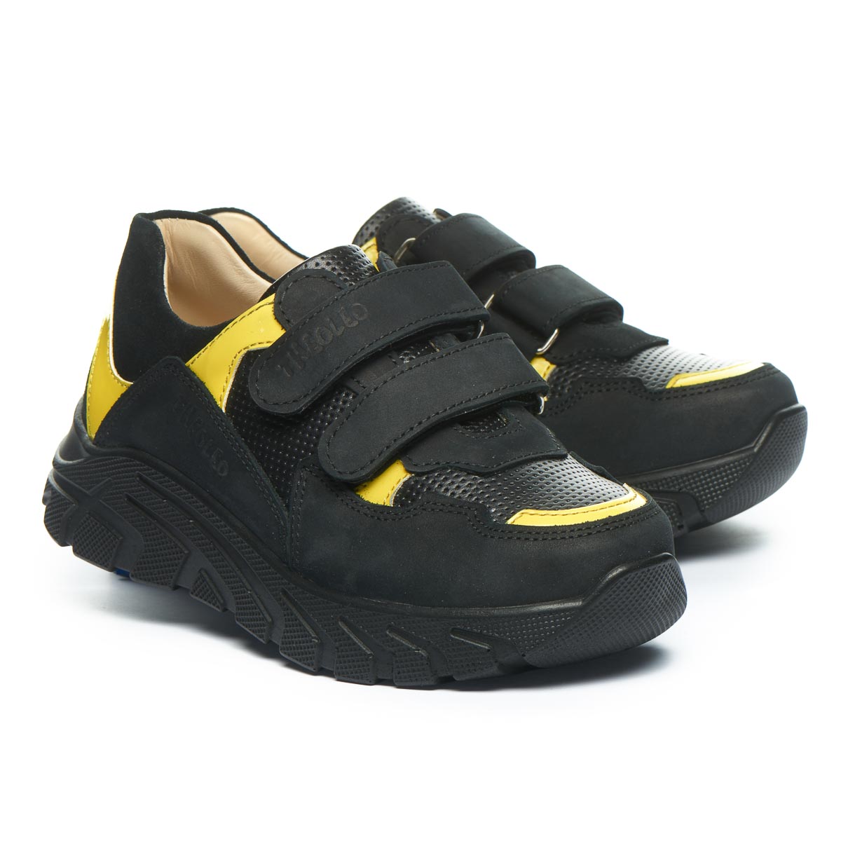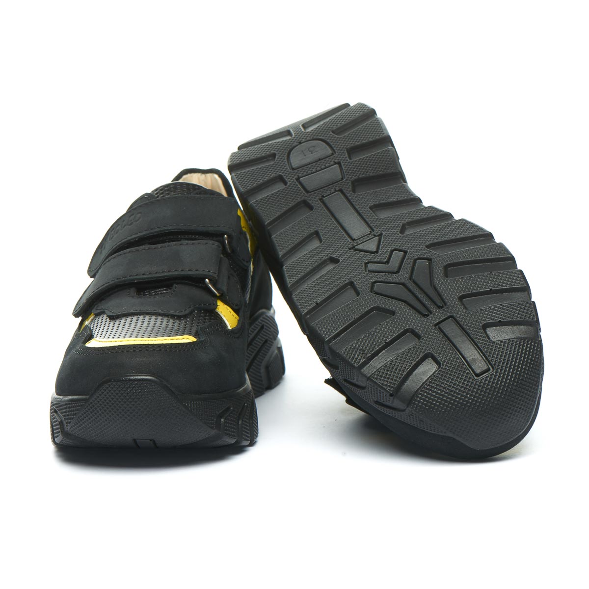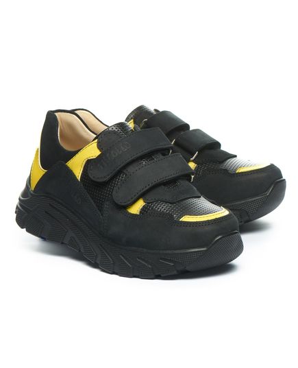 Кросівки з чорної шкіри та нубуку, прикрашені яскравими жовтими декоративними вставками, стануть чудовим доповненням гардеробу. Взуття забезпечить максимальний комфорт. Дві липучки-застібки дозволяють легко надягати та знімати взуття. Ортопедична устілка з анатомічний супінатор підтримує правильне положення стопи, зменшуючи навантаження на суглоби та м'язи. А жорсткий задник надає додаткову підтримку. Ці кросівки призначені для всіх, незалежно від статі, і підходять як дівчатам, так і хлопцям.