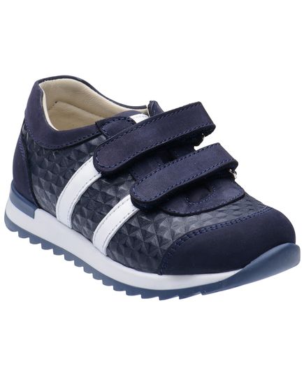 Кросівки для хлопчиків, у темно-синьому кольорі. Виконані з натуральної шкіри та доповнені вставками з натурального нубуку. Дві липучки застібки гарантують легке взування та надійну фіксацію. Ортопедична устілка з анатомічний супінатор підтримує правильне положення стопи, зменшуючи навантаження на суглоби та м'язи. Підошва з термопластичної гуми. Ці кросівки ідеально підходять як для школи, так і для прогулянок.
