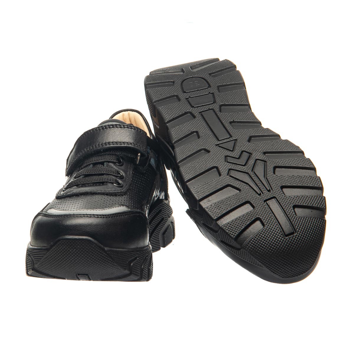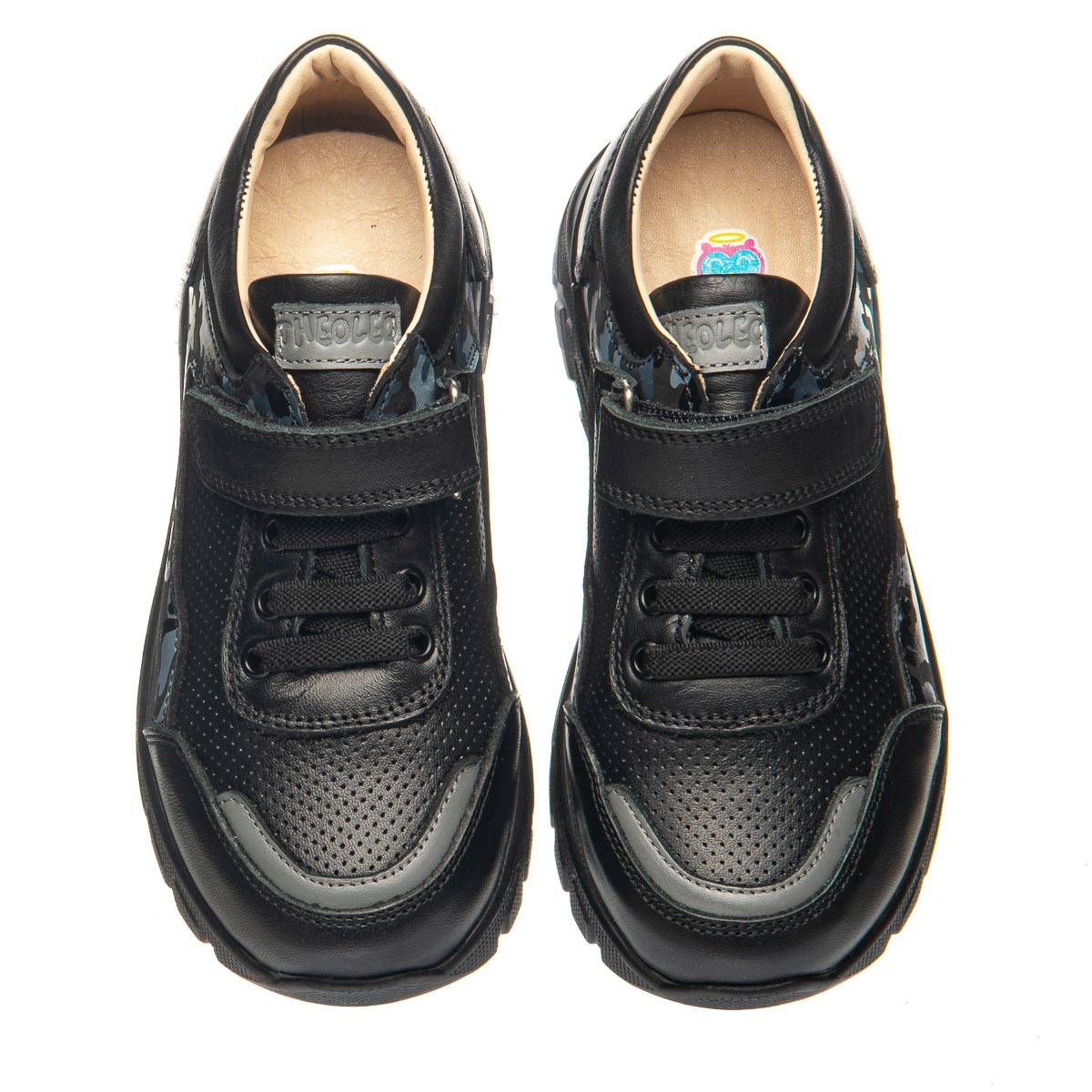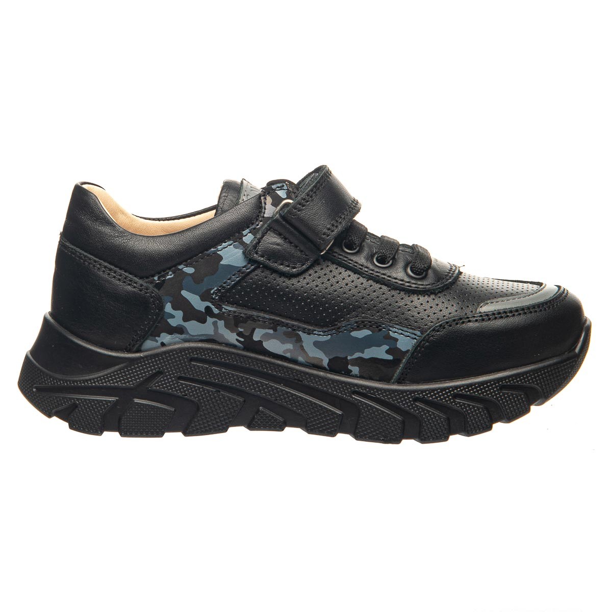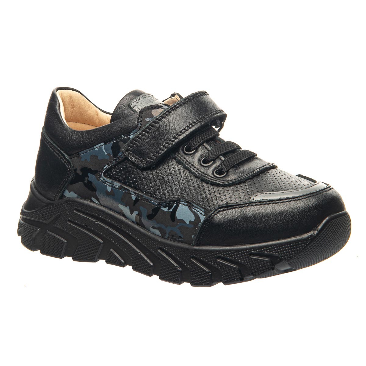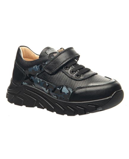 Чорні шкіряні кросівки для хлопчика, виготовлені з високоякісної натурального шкіри, що надає їм довговічність та гарного вигляду. Мають декоративне забарвлення у стилі «мілітарі». В якості застібок використовуються гумові шнурки та липучку для гарної фіксації по ніжці. Устілка з анатомічним супінатором забезпечить правильне положення стопи, а жорсткий задник надасть додаткову підтримку. Рельєфна модна підошва не тільки забезпечує комфорт під час ходьби, але і додає спортивний та модний акцент цьому взуттю.