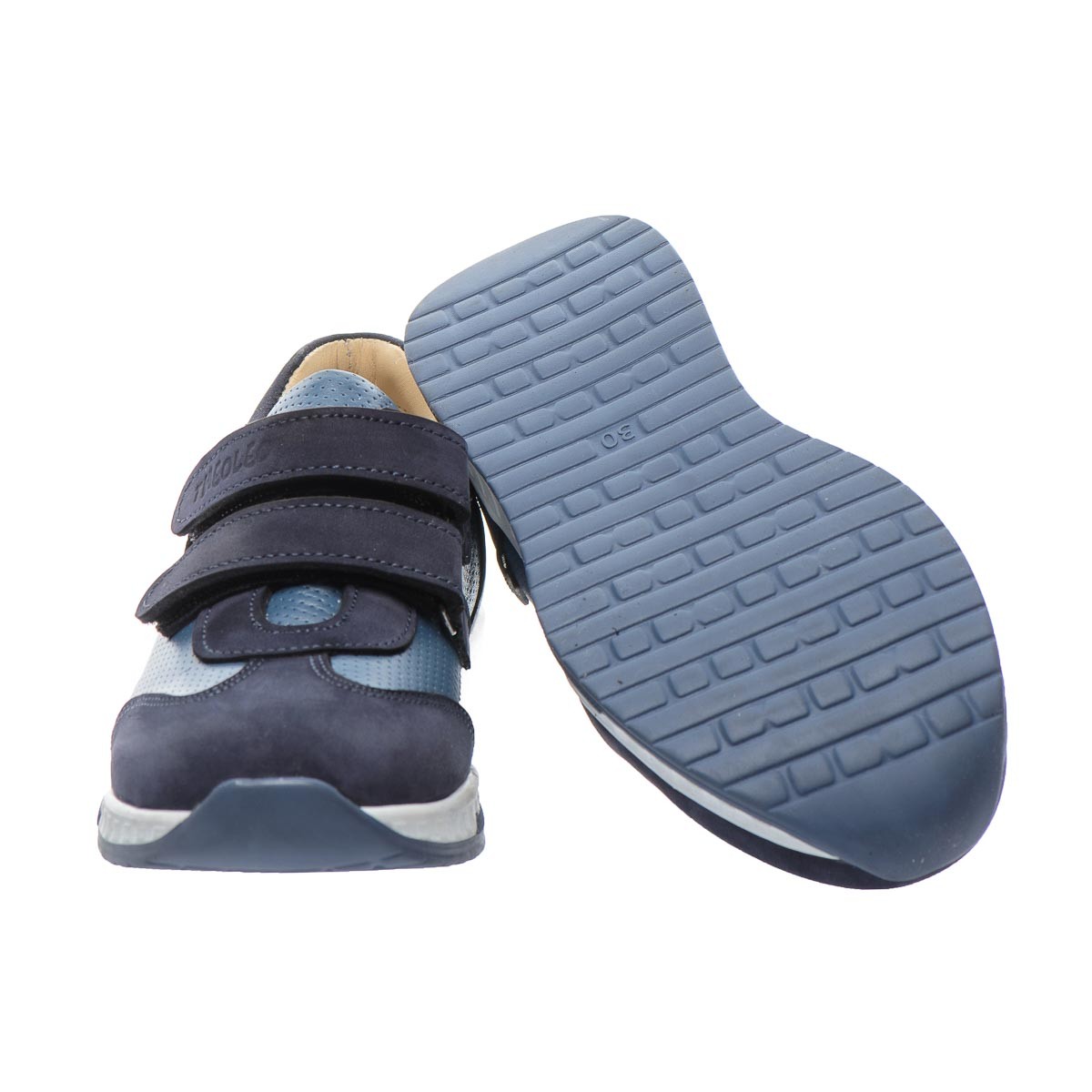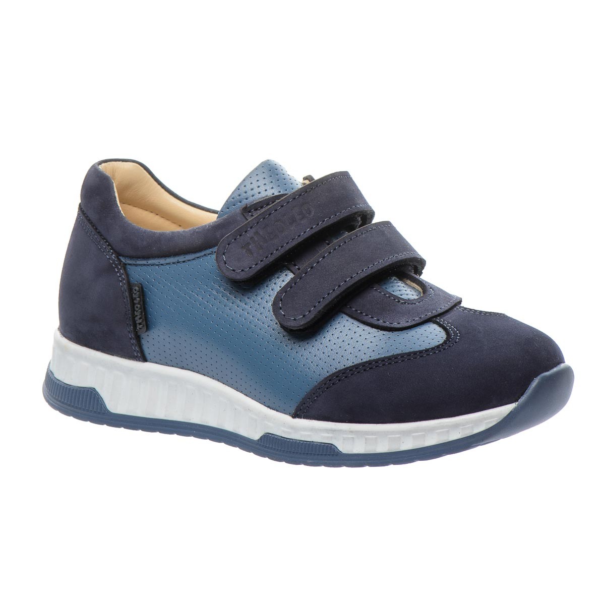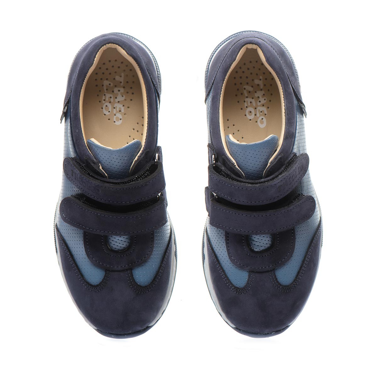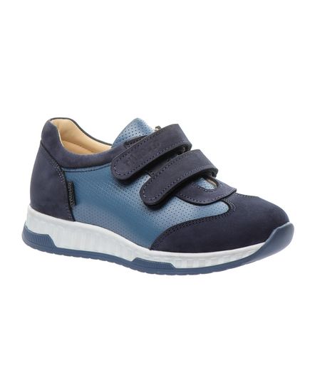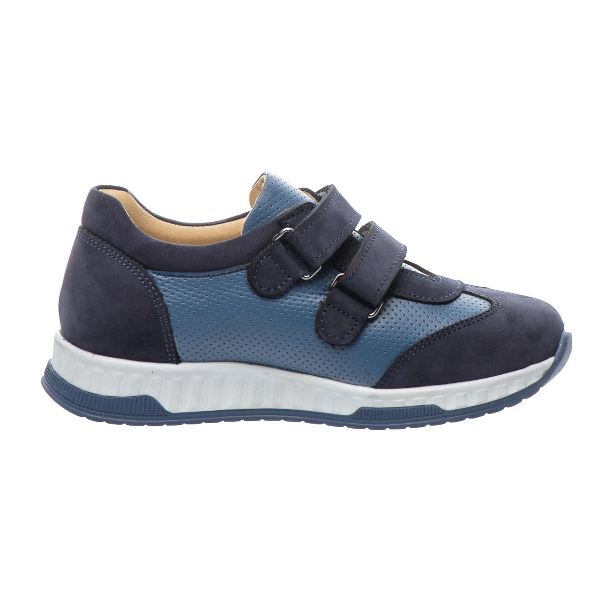 Кросівки для хлопчика виконані у синій та темно-синій колірній гамі. М'який нубук ефектно поєднується зі шкіряними вставками, які мають не наскрізну перфорацію. Дві липучки-застібки дозволяють легко надягати та знімати взуття. Ортопедична устілка з анатомічний супінатор підтримує правильне положення стопи, зменшуючи навантаження на суглоби та м'язи. А жорсткий задник надає додаткову підтримку. Підошва з термопластичної гуми. Сучасний дизайн дозволяє поєднувати ці кросівки з будь-яким одягом, роблячи їх ідеальними для школи чи прогулянок.