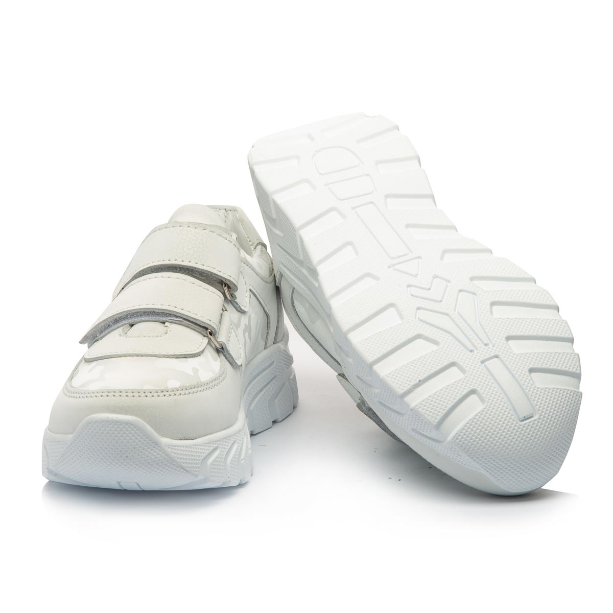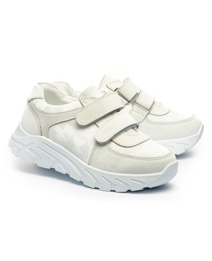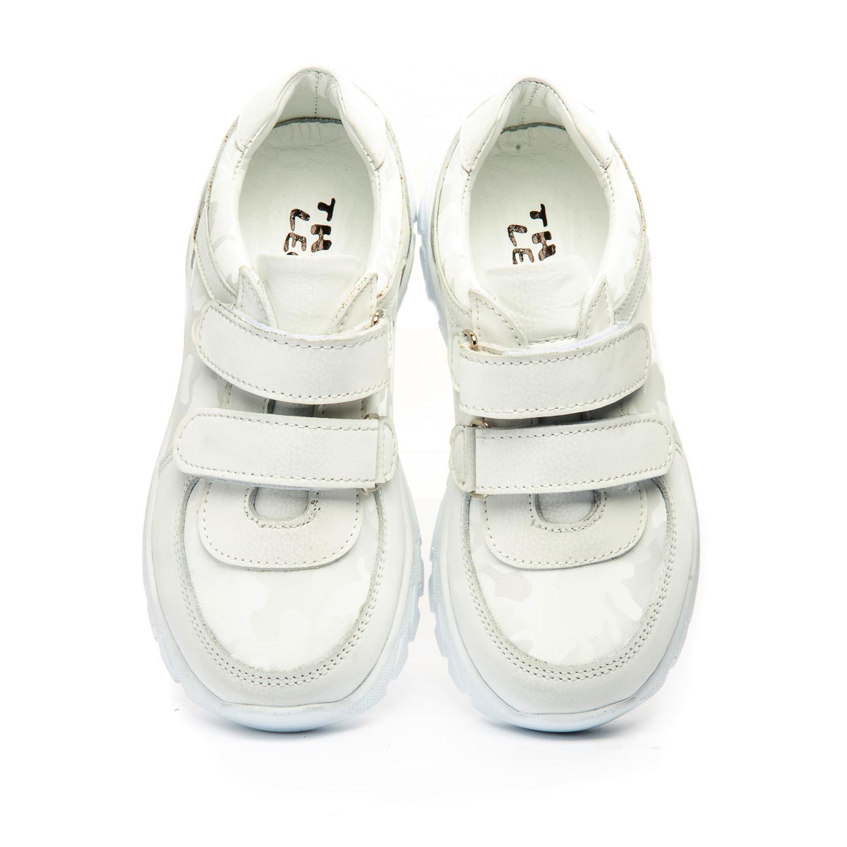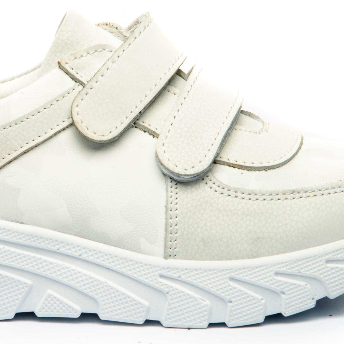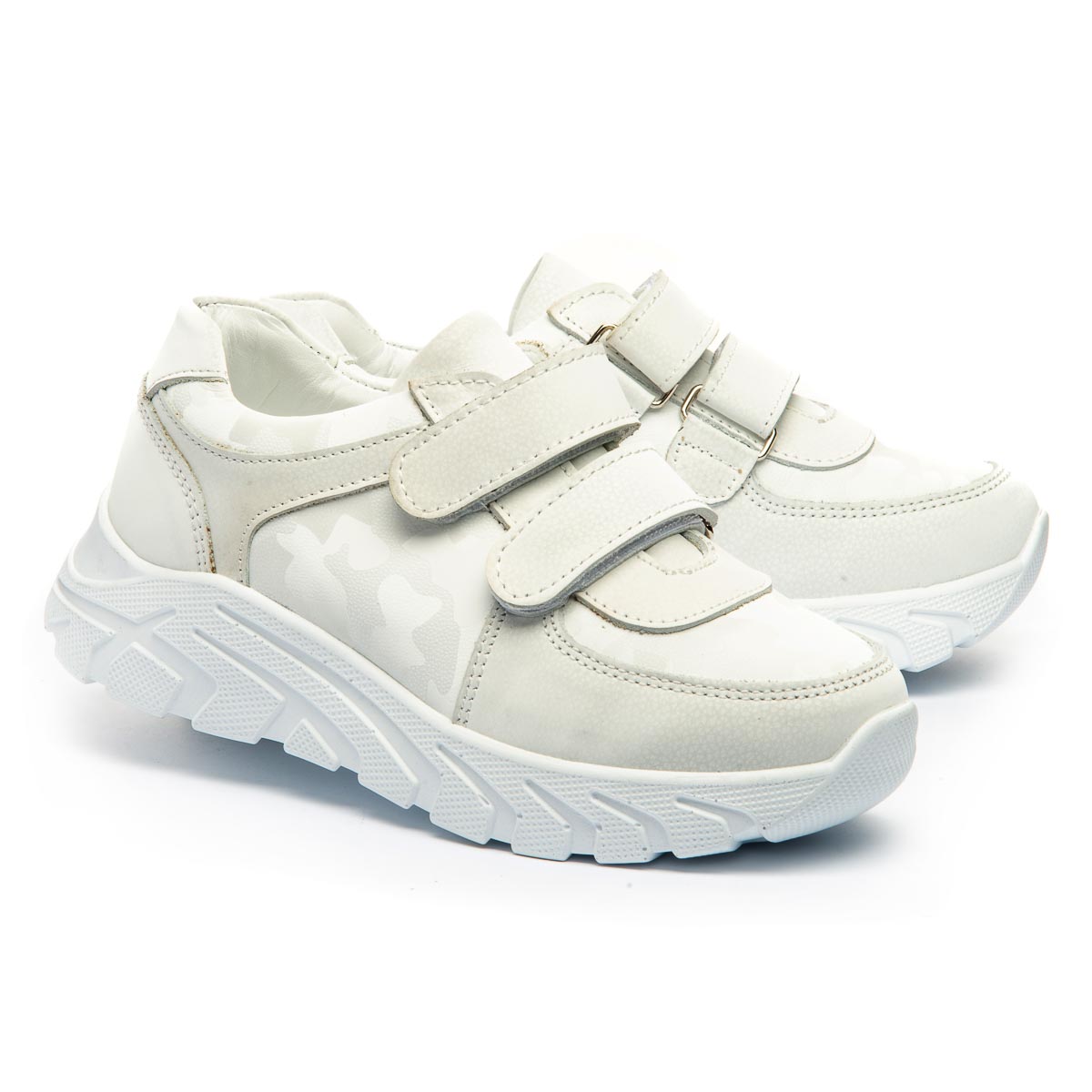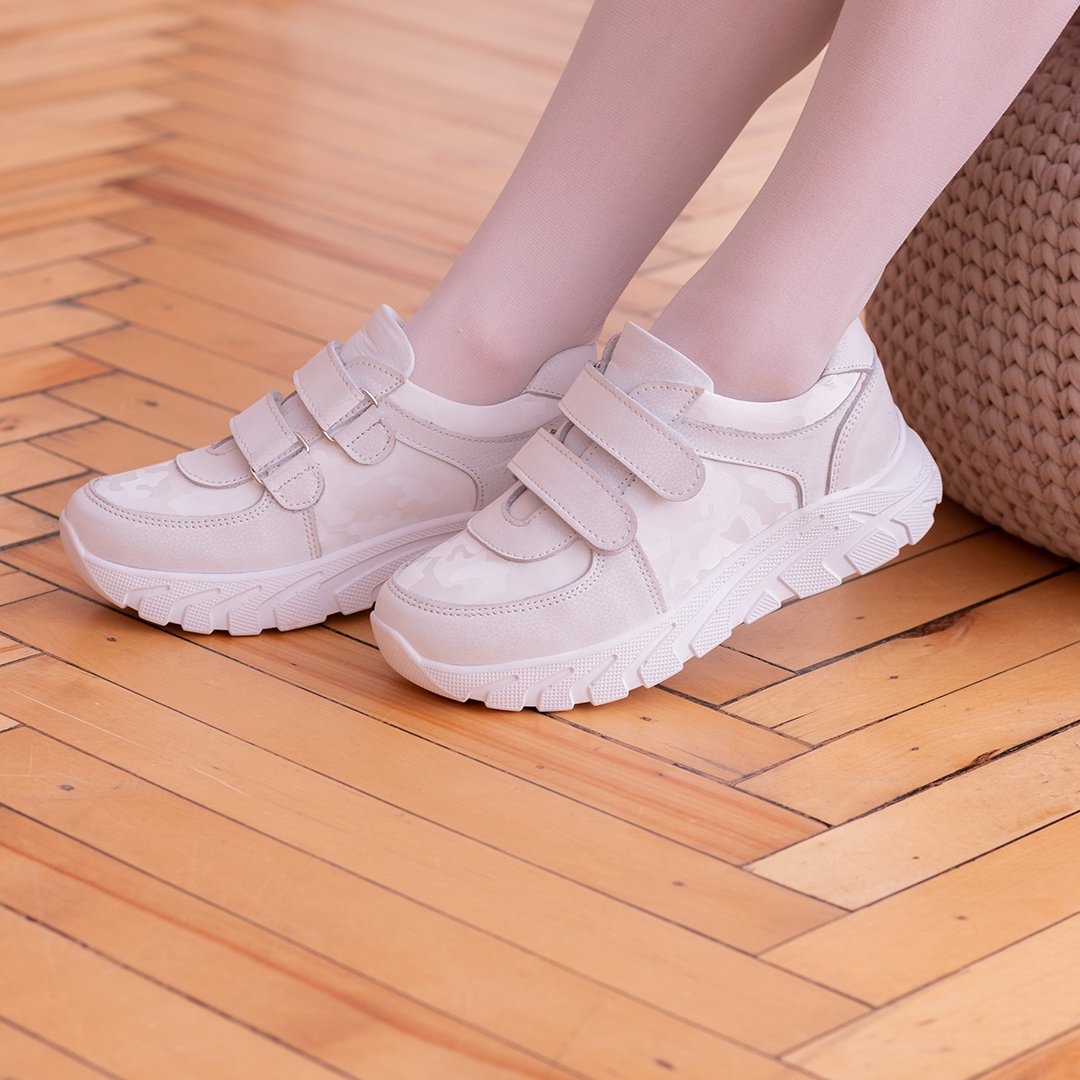 Білі дитячі кросівки з натуральної шкіри в камуфляжному дизайні. Легко одягаються завдяки двом липучкам, з посиленим носком для довговічності та анатомічним супінатором для правильного розвитку стопи. Внутрішня частина і устілка з натуральної шкіри забезпечують комфорт, а термопластична гумова підошва не ковзає та добре амортизує.