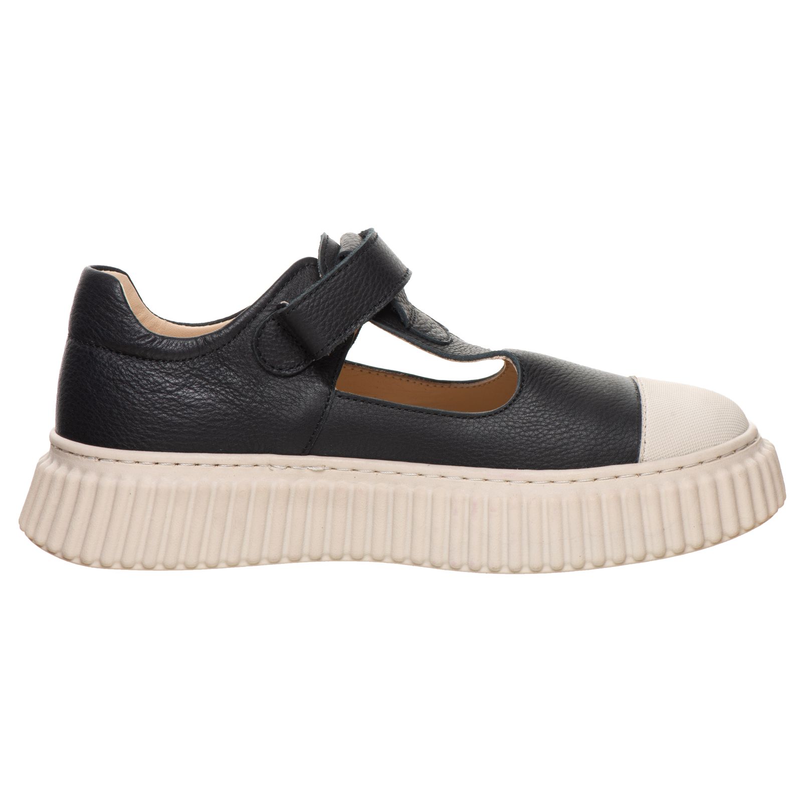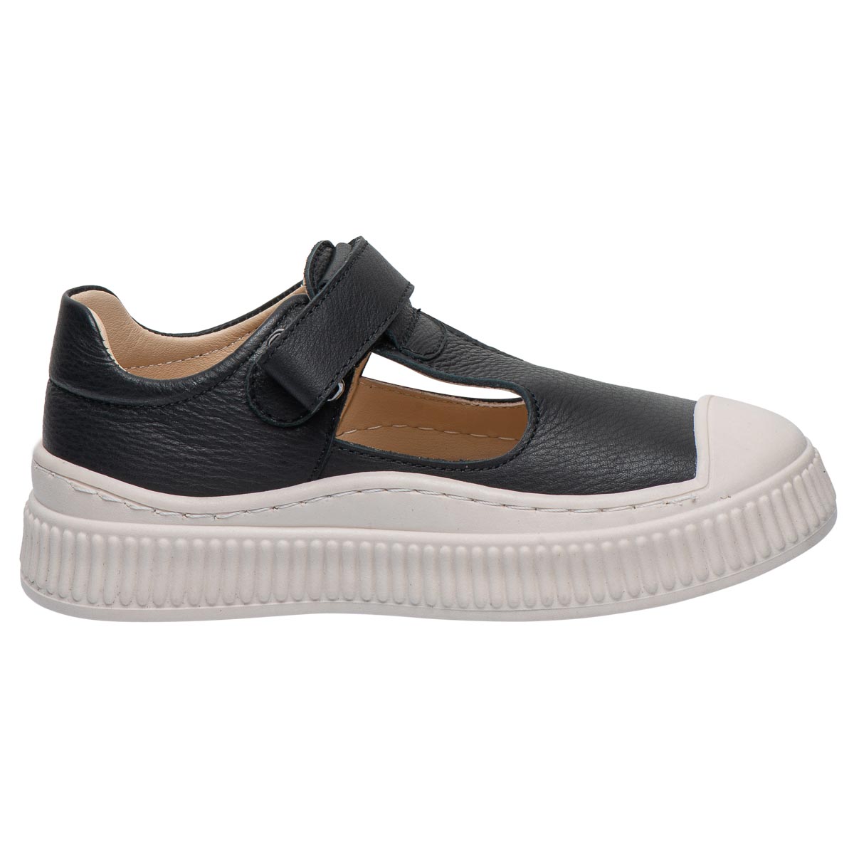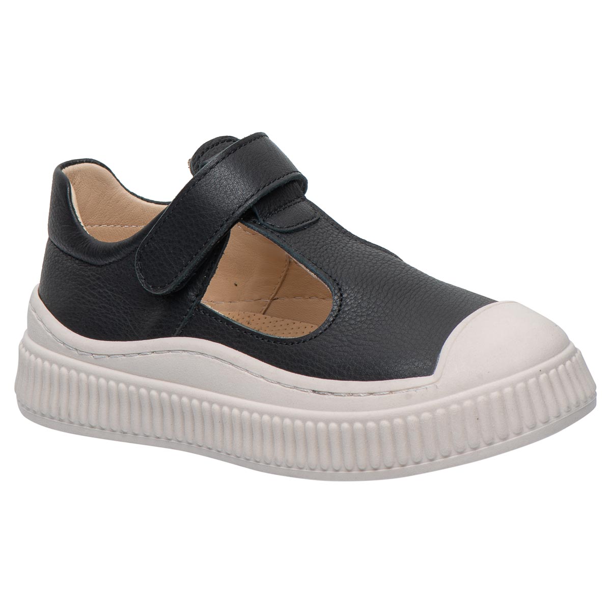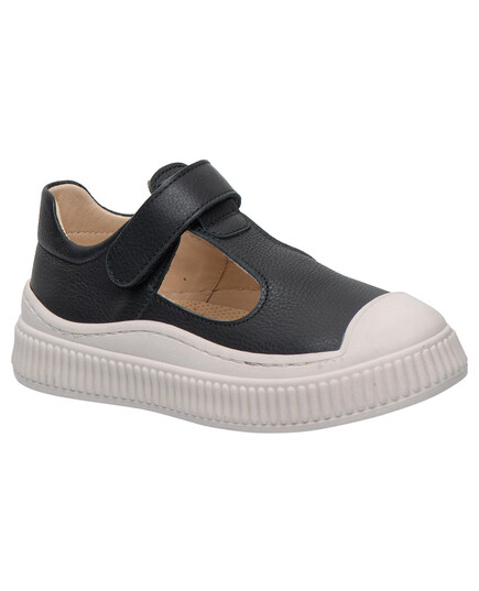 Стильні мокасини для дівчат з натуральної шкіри у класичному чорному кольорі — поєднання елегантності та зручності. Т-подібний виріз створює стильний та акуратний вигляд. Завдяки зручній застібці на липучці взуття легко взувати й добре фіксувати на ніжці. Масивна біла підошва з рельєфом додає сучасного стилю та гарантує надійну стійкість на різних поверхнях. Це взуття стане ідеальним вибором для школи, прогулянок чи святкових образів, дозволяючи дитині виглядати модно й відчувати себе комфортно.