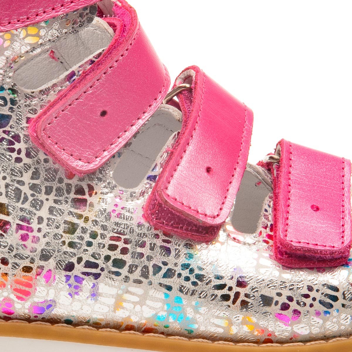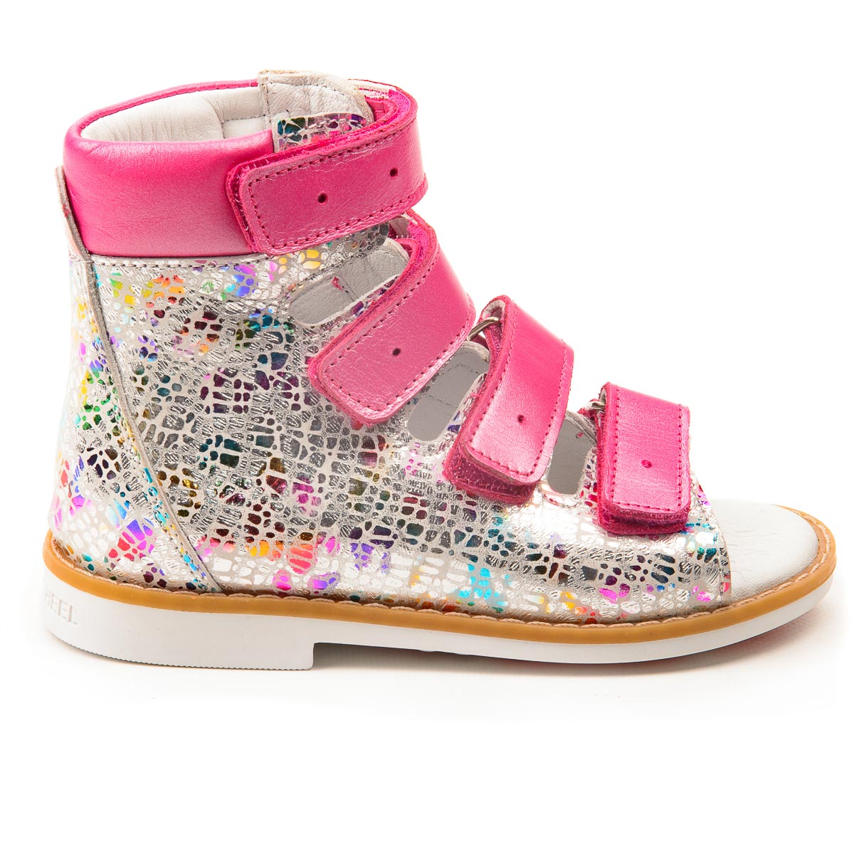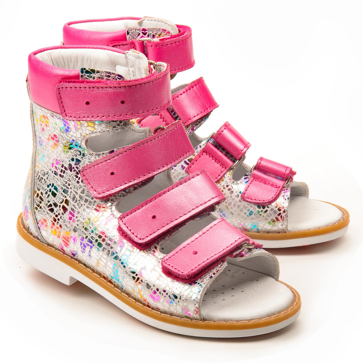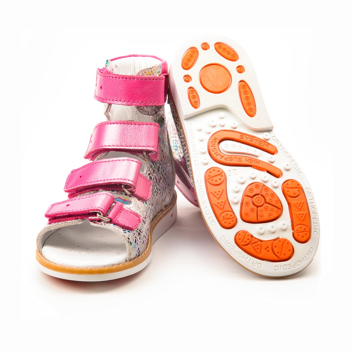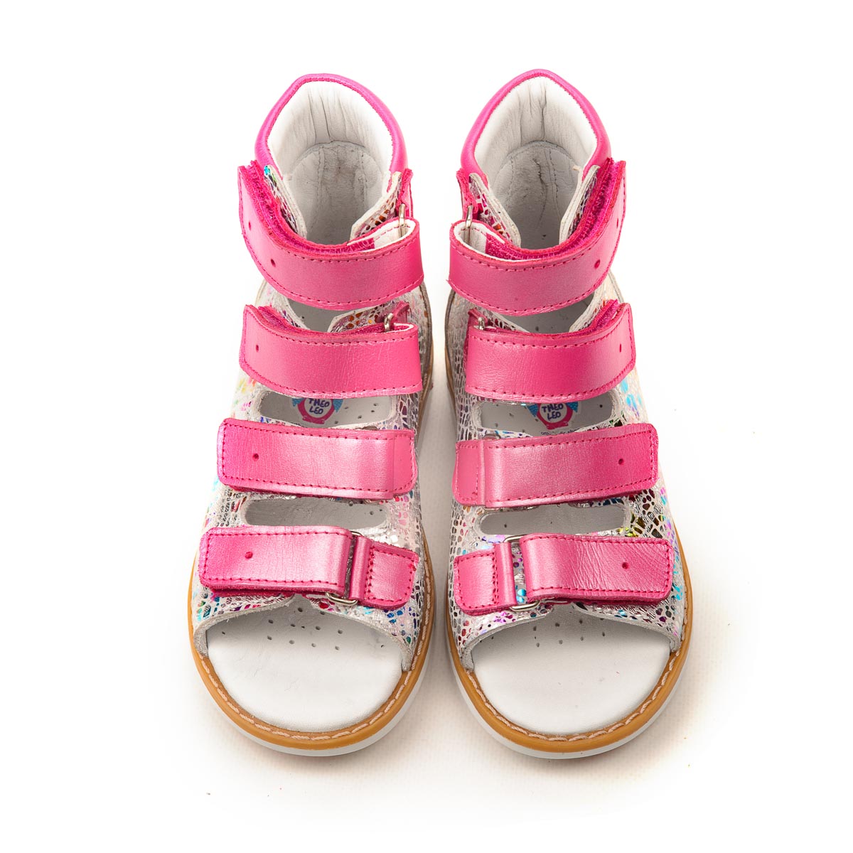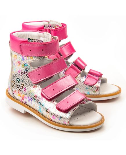 Яскрава модель ортопедичних босоніжок для дівчаток, з високим берцем — чудовий вибір для турботливих батьків. Виготовлені з натуральної шкіри, мають чотири липучки-застібки. Під час створення босоніжок дотримано всі необхідні вимоги до ортопедичного взуття: