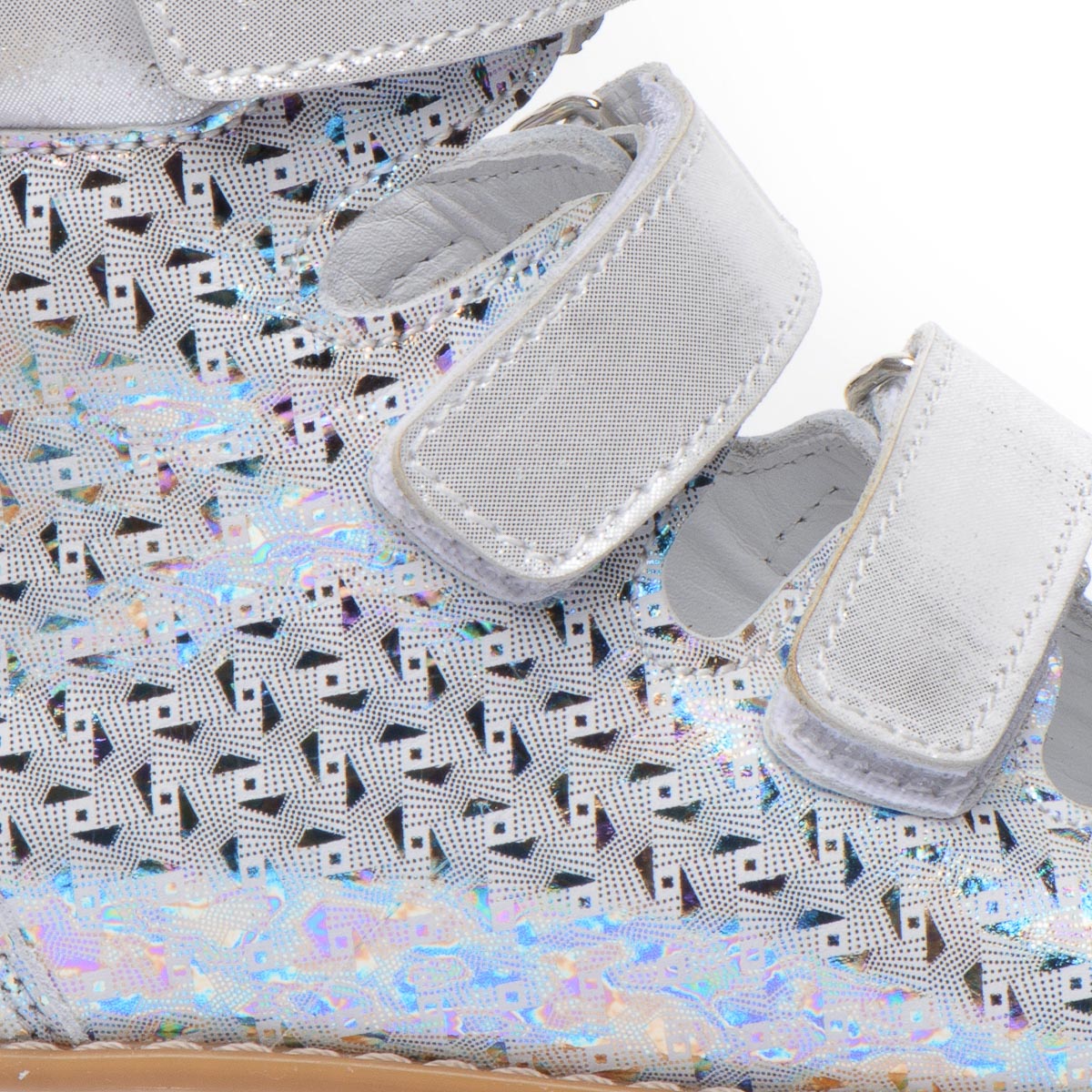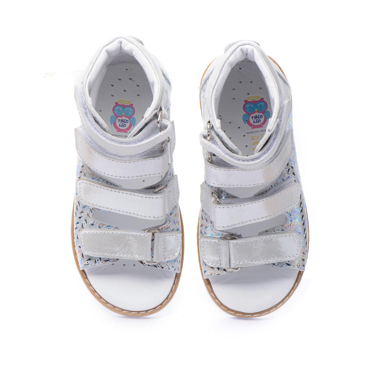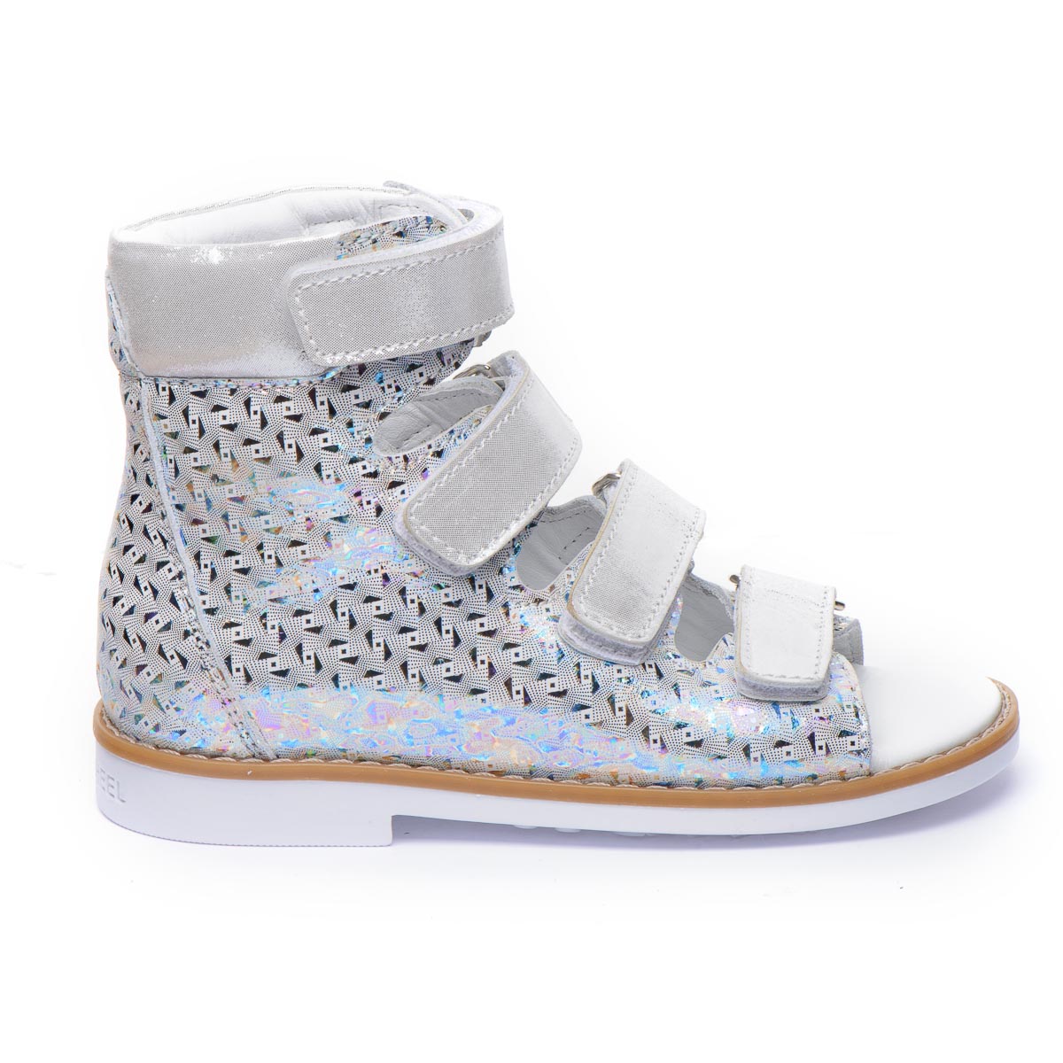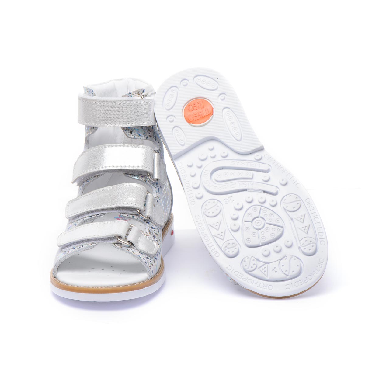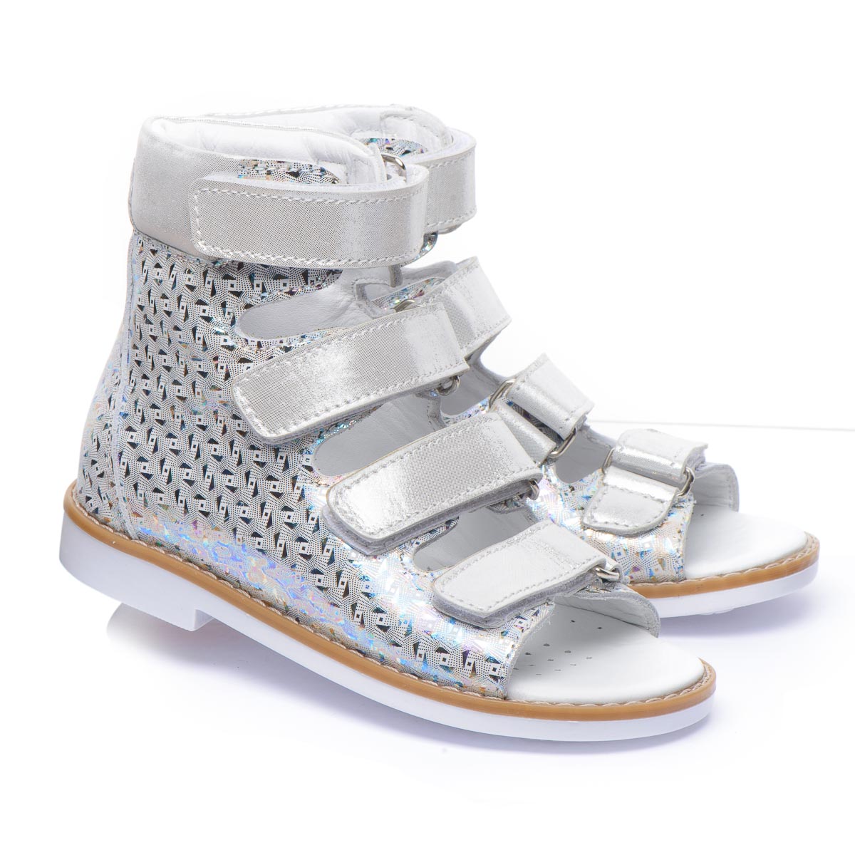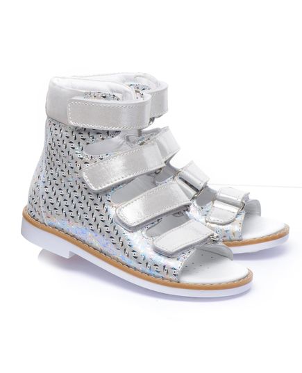 Ортопедичні босоніжки для дівчаток виготовлені з натуральної шкіри зі сріблястим візерунком. Кожна пара оснащена чотирма липучками для легкої і швидкої фіксації на нозі. Під час створення босоніжок дотримано всі необхідні вимоги до ортопедичного взуття: