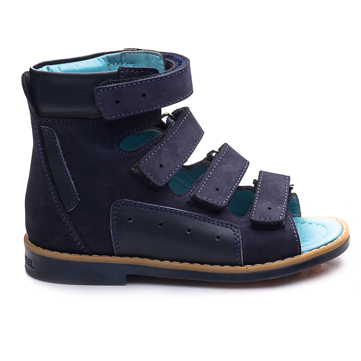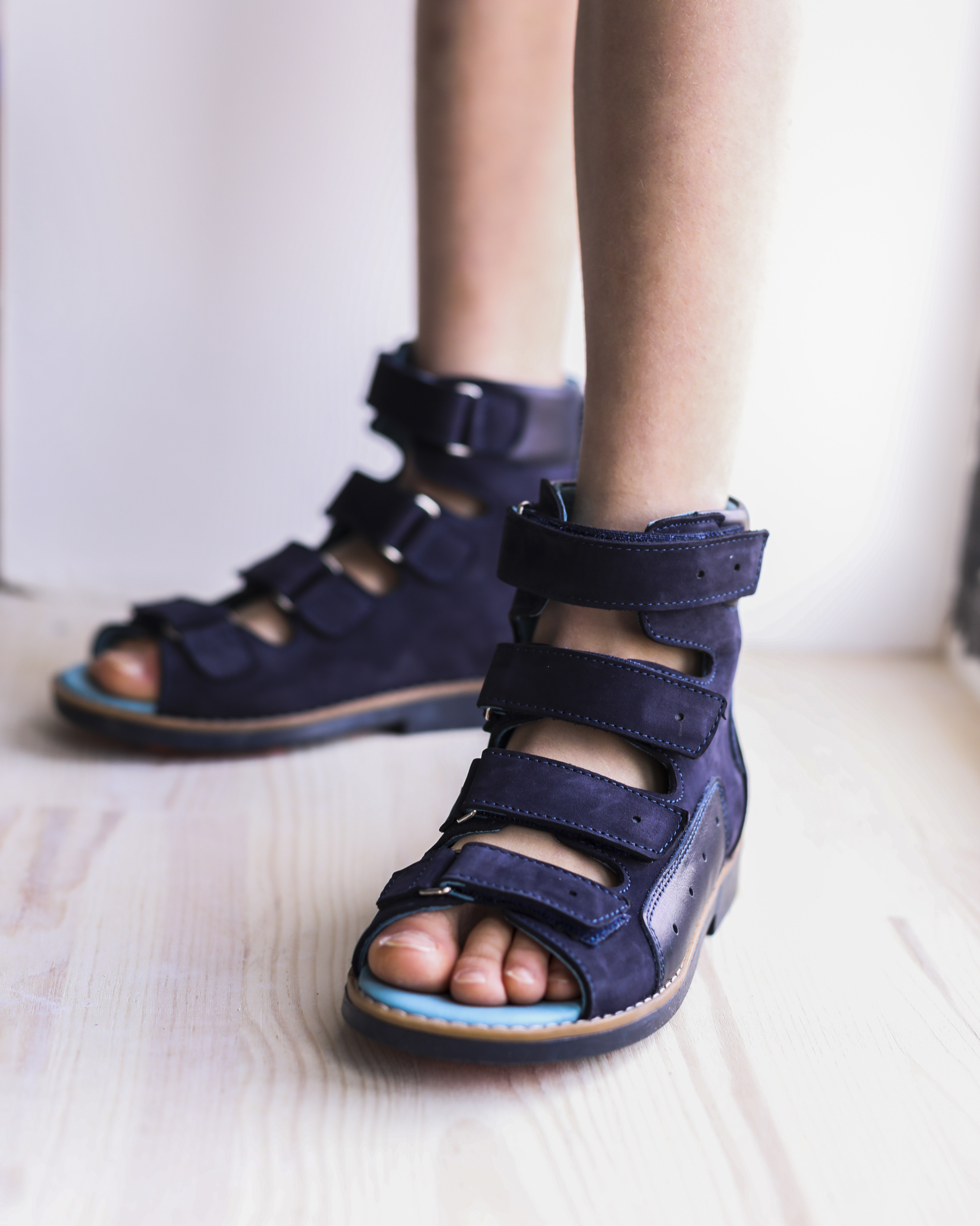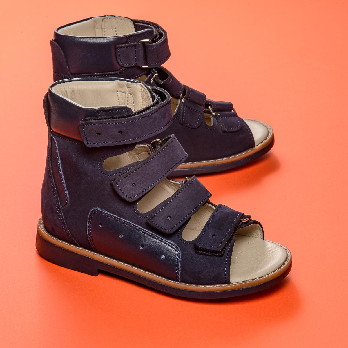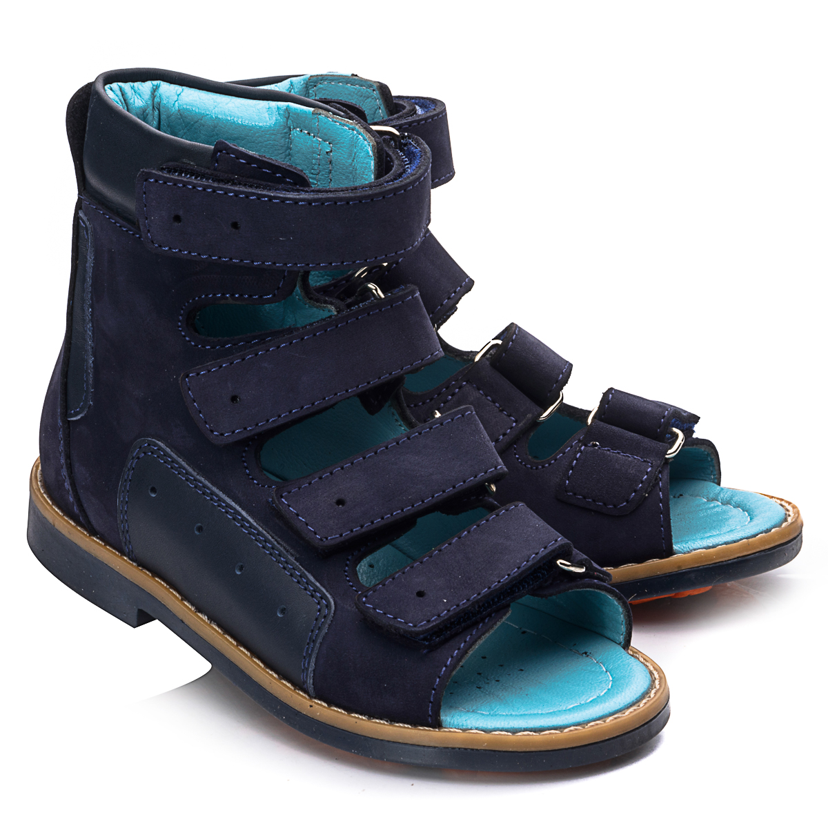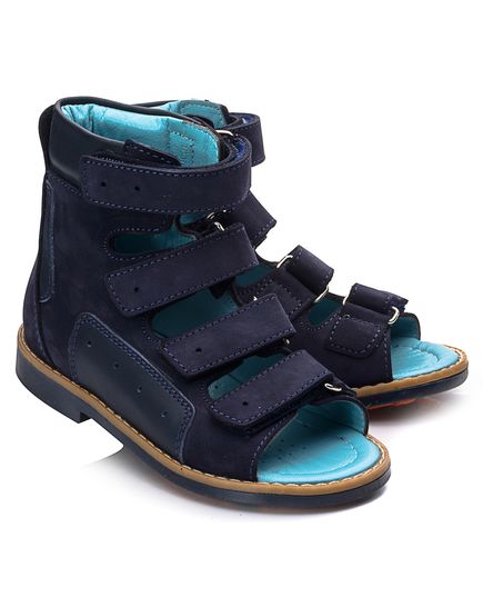 Ортопедичні босоніжки для хлопчика виконані з натурального нубуку темно-синього кольору з шкіряними вставками в тон. У цій моделі поєднуються стиль і комфорт. Підкладка та устілка - натуральна шкіра блакитного кольору. Верх босоніжка м'який, щоб не натирати ніжну дитячу шкіру. Дотримані всі необхідні вимоги до ортопедичного взуття: анатомічний супінатор, жорсткий задник, високі берці, чотири липучки, каблук Томаса, підошва, що не ковзає. Приємний колір і відмінна якість - ця пара припаде до душі вам і вашій дитині.