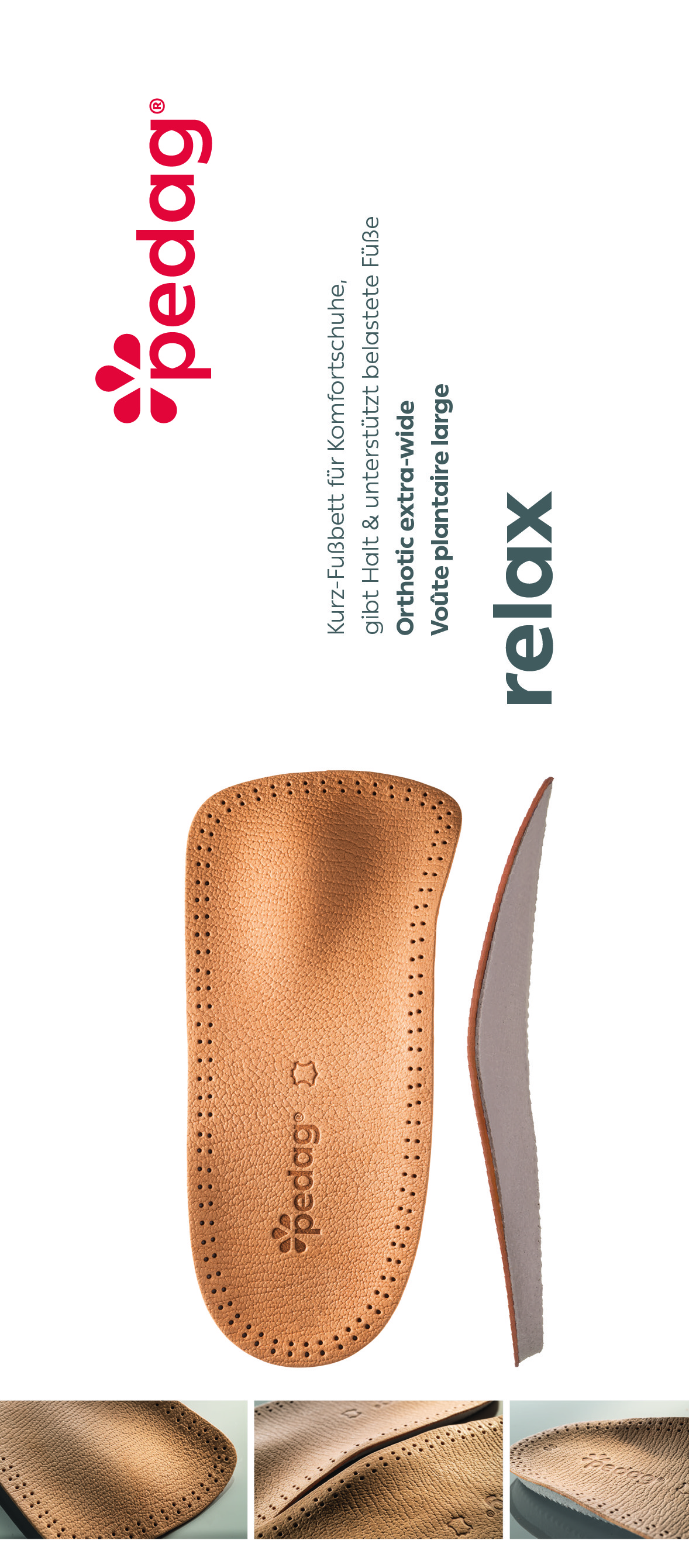- Анатомічна форма напівустілки PEDAG Relax ефективно підтримує поздовжнє склепіння і перешкоджає появі симптомів втомлених ніг при плоскостопості, добре розслабляє напружені ноги;
