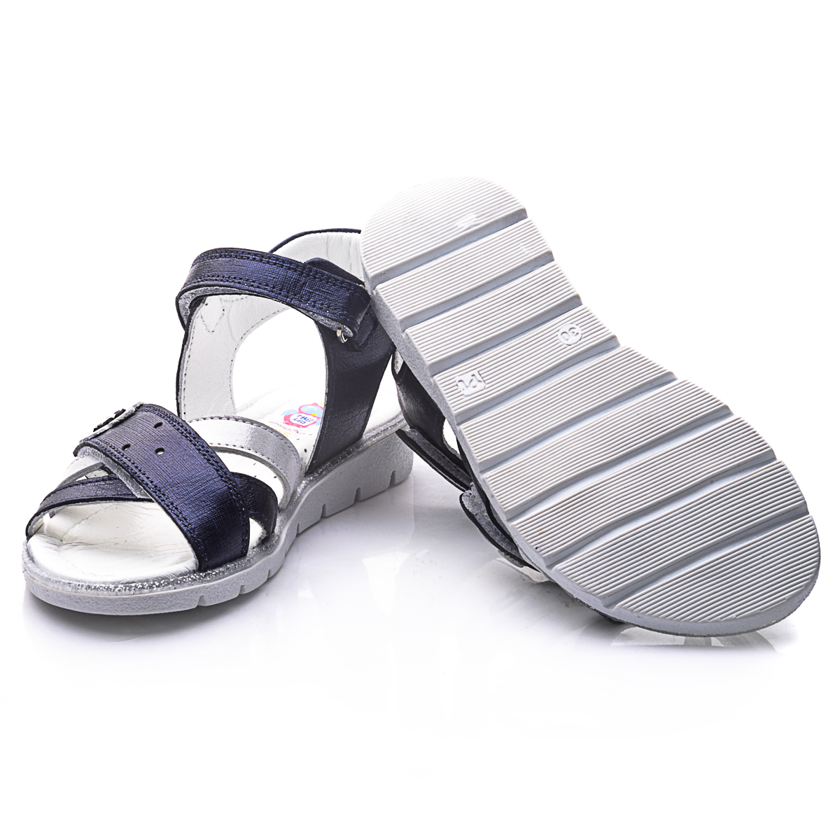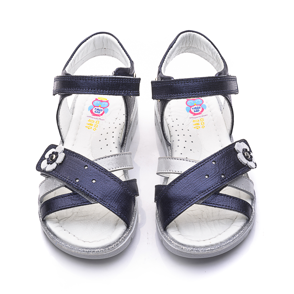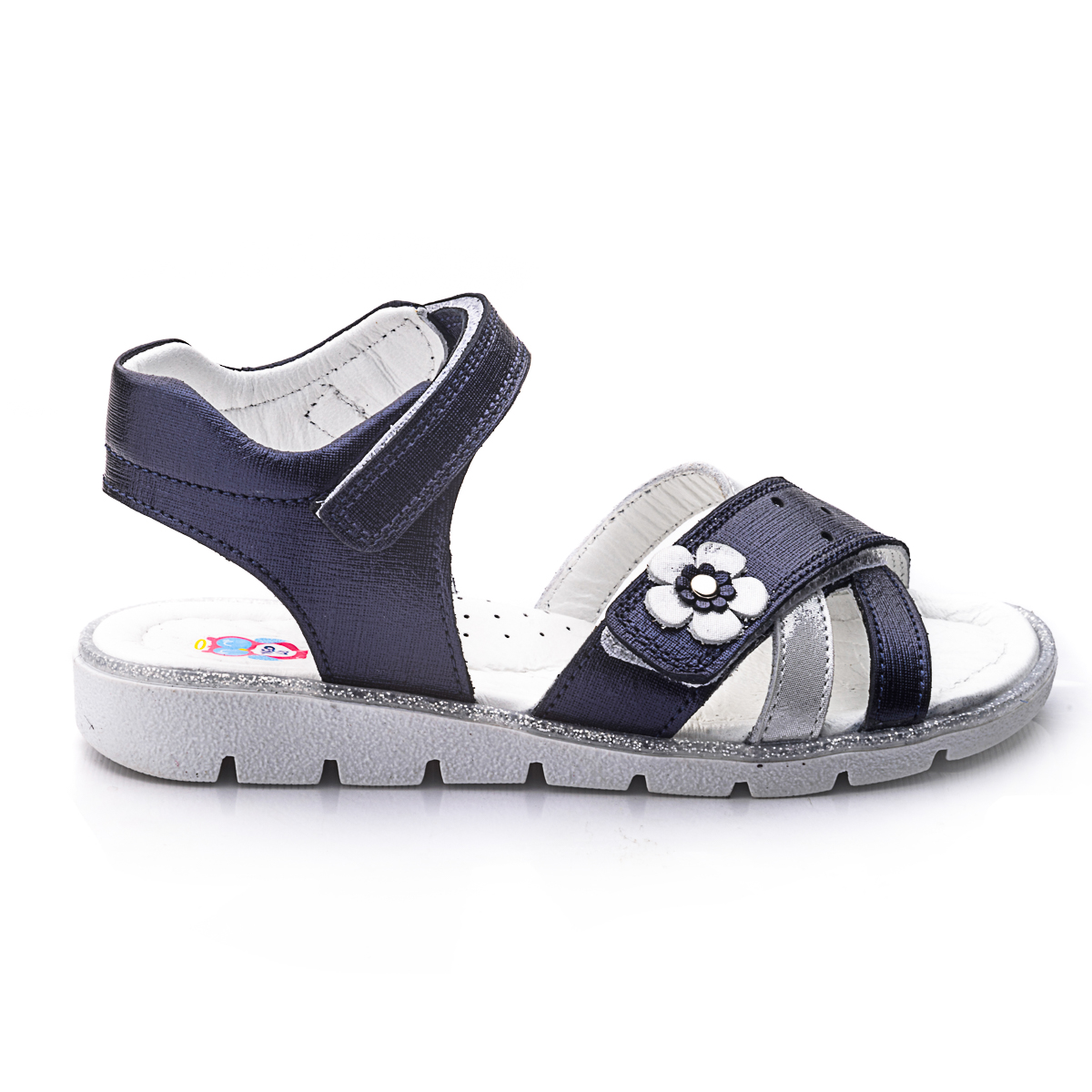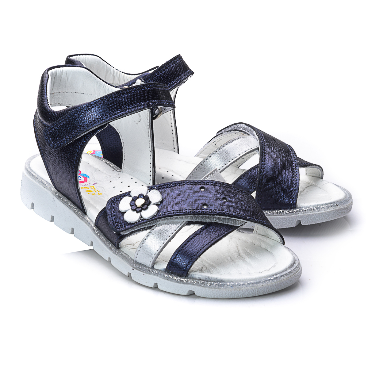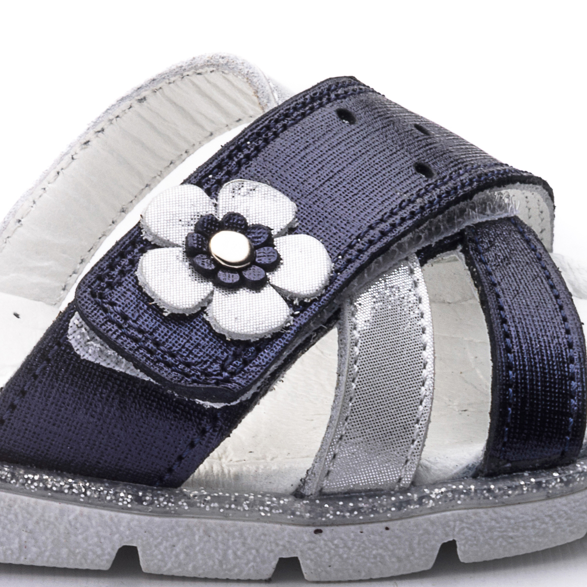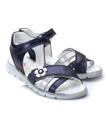 Сандалі для дівчаток виготовлені з темно-синьої шкіри з сатиновим ефектом. Дуже легкі та зручні, прикрашені смужкою з сріблястою шкіри і сріблястою квіточкою. Устілка і підкладка також натуральна шкіра. Підошва - термопластична гума, яка не дає нозі ковзати і відмінно амортизує при ходьбі. Сандалі фіксуються на щиколотці за допомогою липучки. Таке взуття обов'язково сподобається будь-якій модниці.