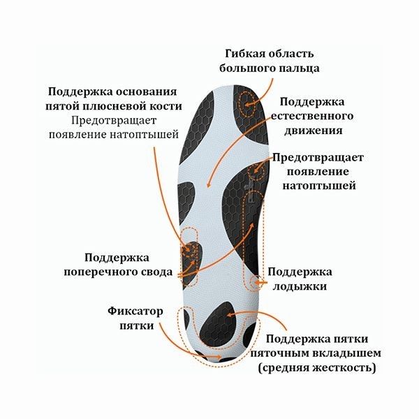 • Анатомічна форма ефективно підтримує поздовжнє склепіння стопи і перешкоджає появі симптомів втомлених ніг;
