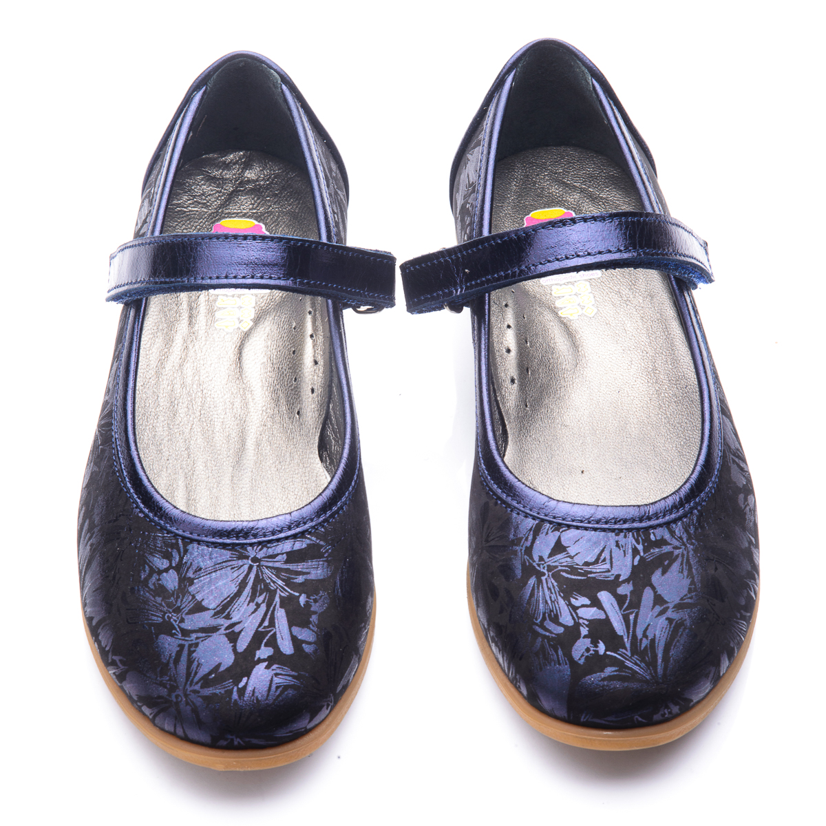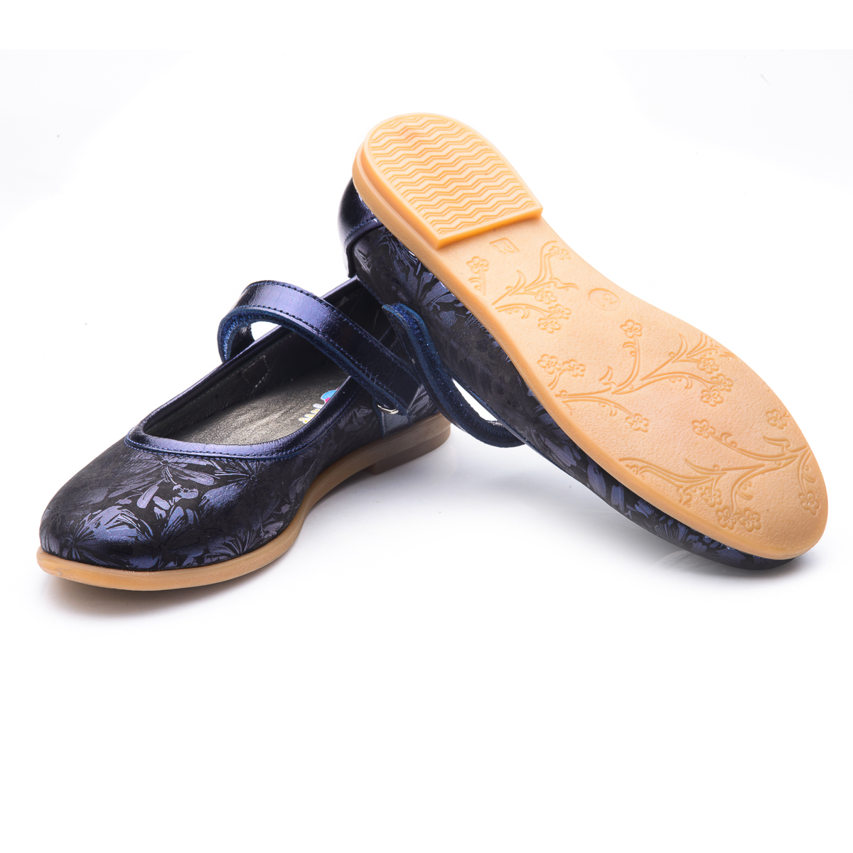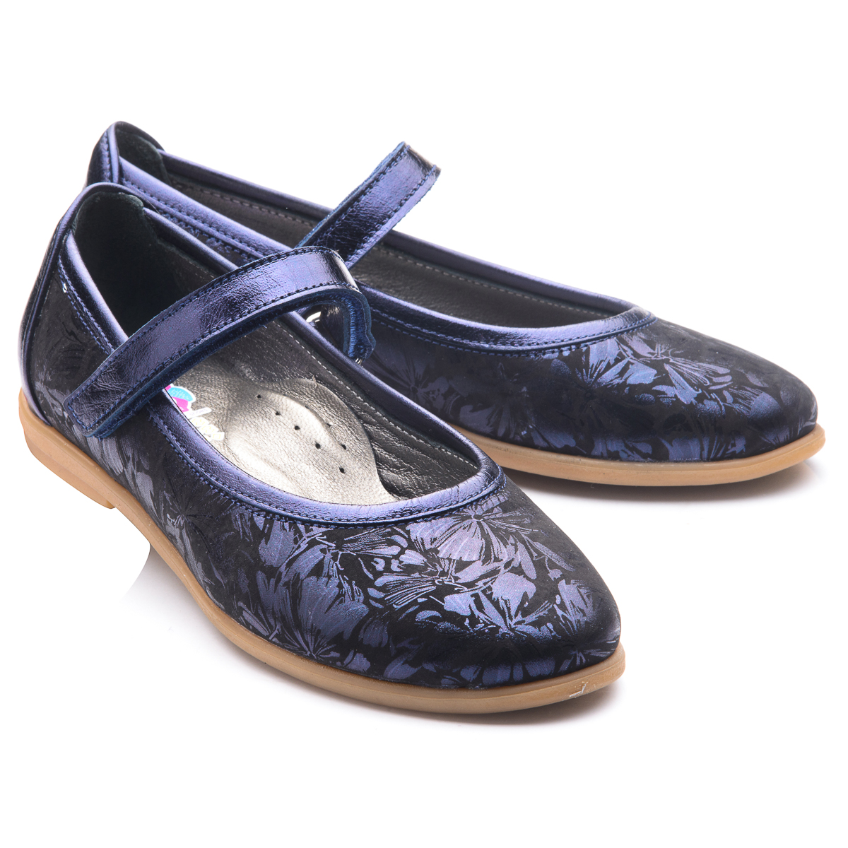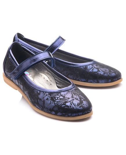 Красиві шкільні туфлі для дівчинки, доповнять і прикрасять повсякденний гардероб вашої модниці. Виконані з натуральної шкіри чорного кольору з нанесеним принтом у вигляді синіх перламутрових кольорів. Для зручного носіння та ходьби модель оснащена липучкою. Устілка доповнена анатомічним супінатором. Вся внутрішня частина взуття - натуральна шкіра. Кремова підошва з термопластичної гуми не ковзає і добре амортизує. Такі туфельки неодмінно припадуть до душі кожній дівчинці!