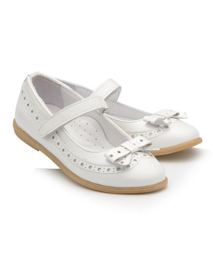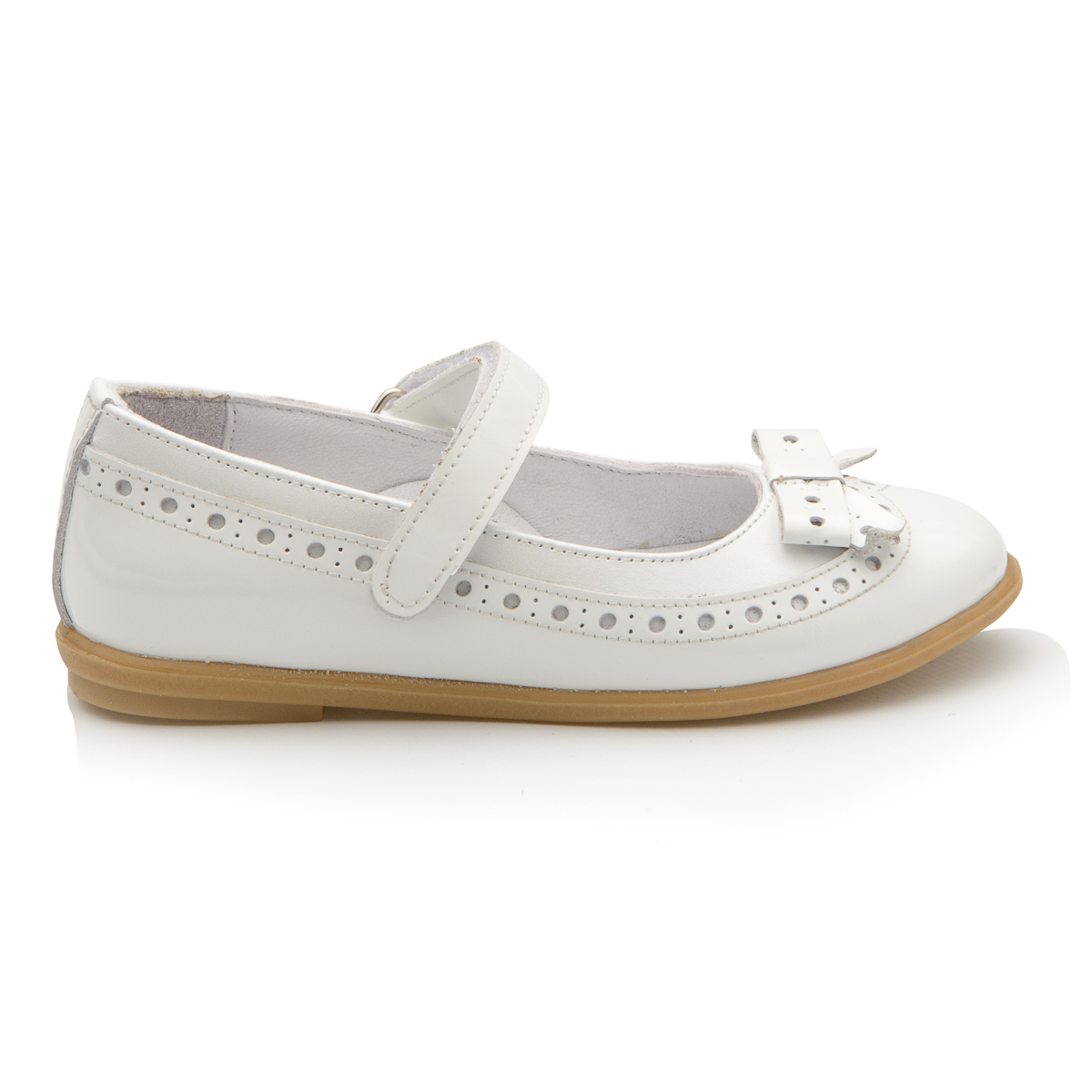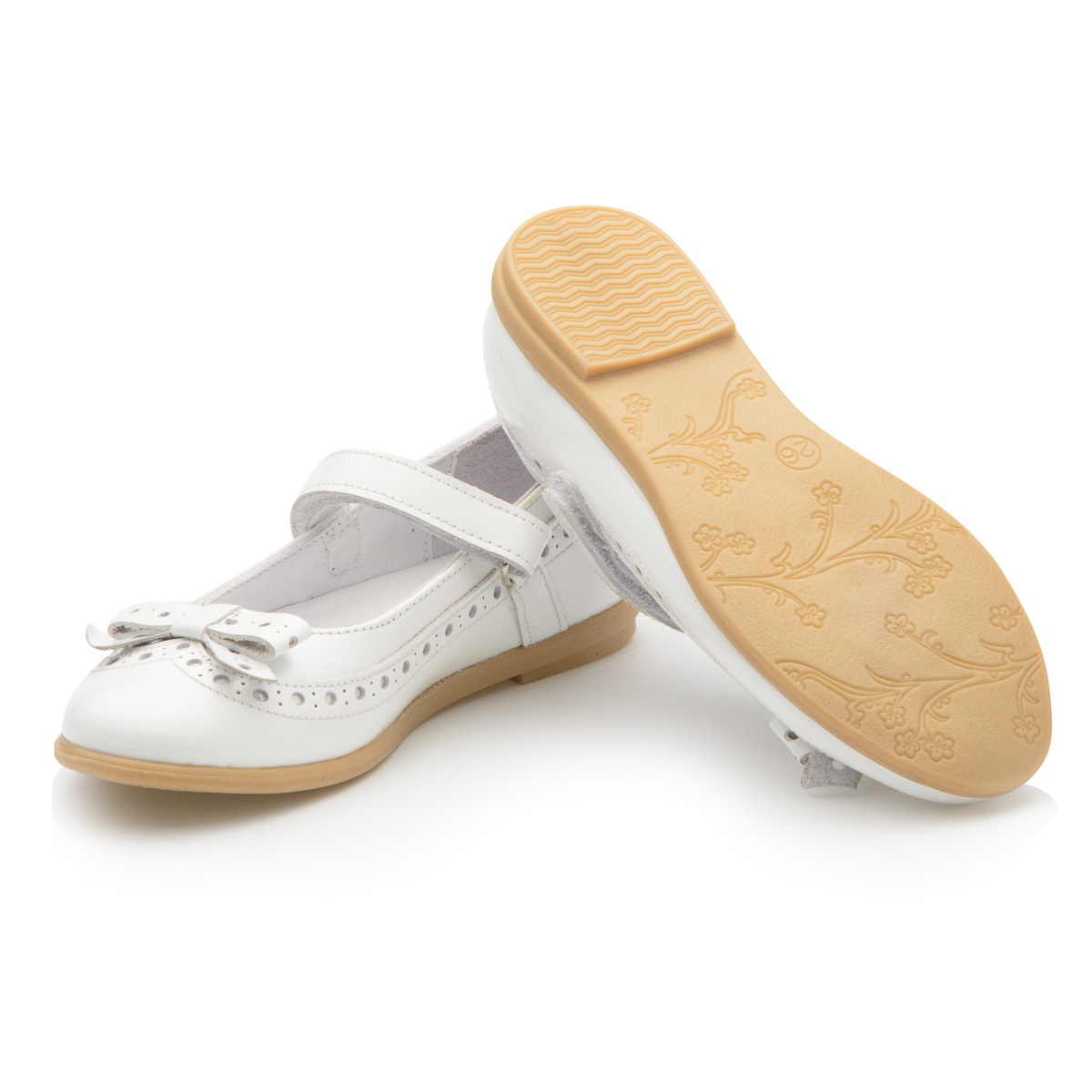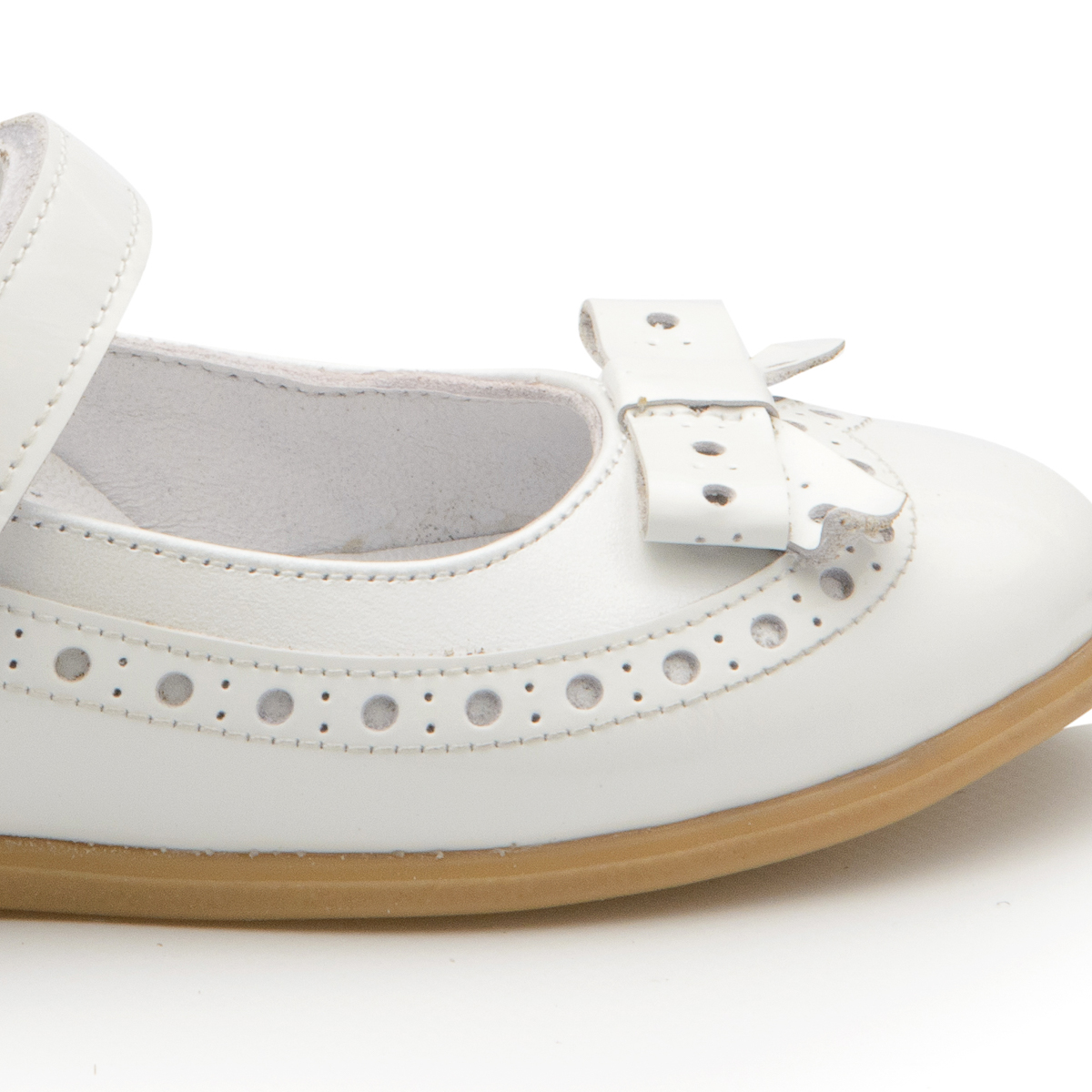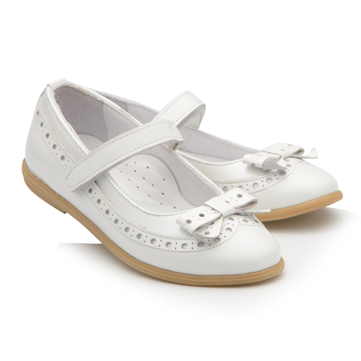 Білі глянцеві туфлі для дівчинки декоровані маленьким бантиком. Виготовлені з натуральної шкіри. Застібка на одній липучці. Легка та гнучка підошва з термопластичної гуми. Шкіряна устілка, має супінатор - створений з урахуванням анатомічних особливостей дитячої стопи. Ці туфлі стануть ідеальним доповненням до святкового образу вашої маленької принцеси.