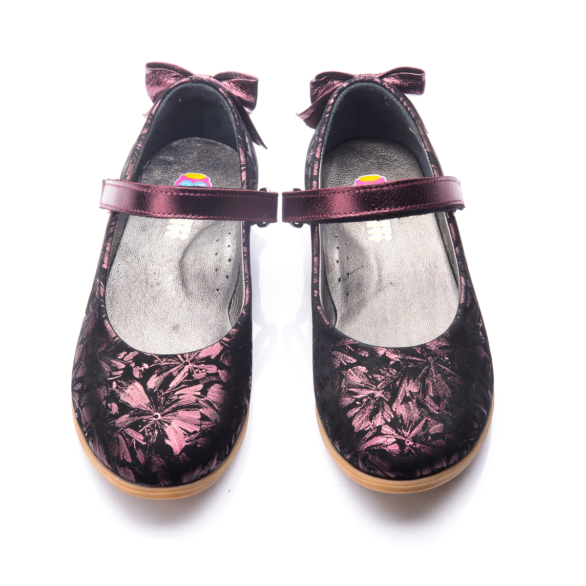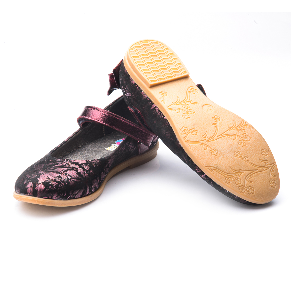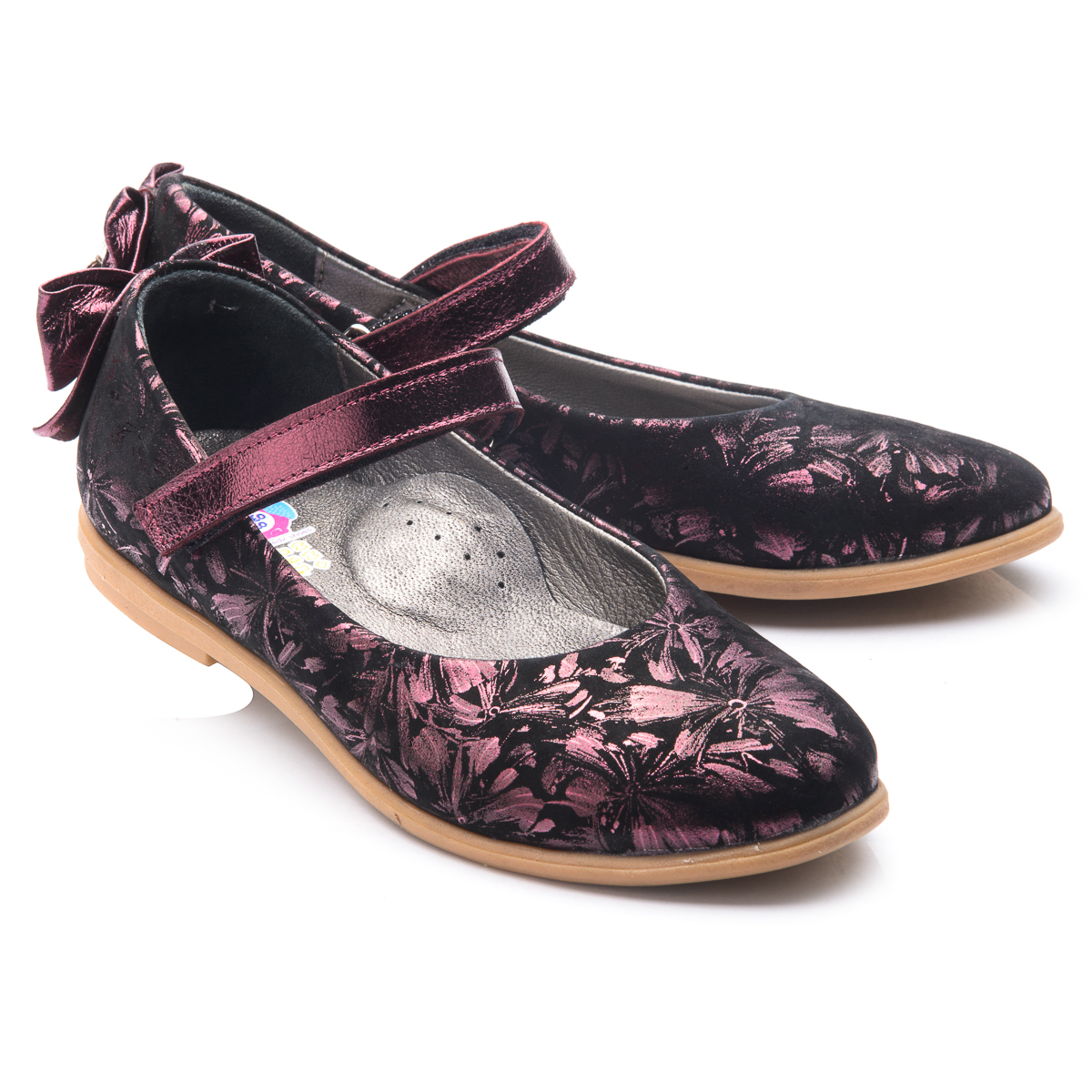 Шкільні туфлі для дівчинки виконані з натурального нубуку чорного кольору з нанесеним принтом «бордові квіти». Декоровані вставкою з бордовою шкіри і бантиком на заднику цього ж матеріалу. Для того, щоб туфельки щільно сиділи на нозі і не злітали при ходьбі, присутній липучка. Устілка з анатомічним супінатором і підкладка - натуральна шкіра. Кремова підошва - термопластичная гума, не ковзає, амортизує і дуже зносостійка. Класична модель туфельок обов'язково підійде під шкільний гардероб дівчинки.