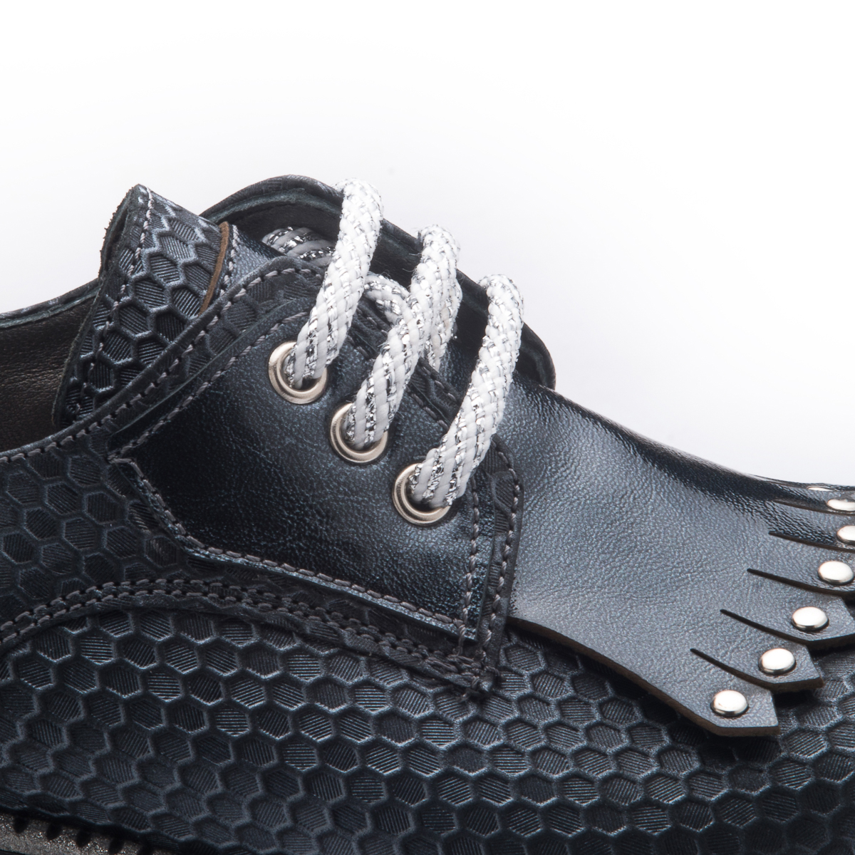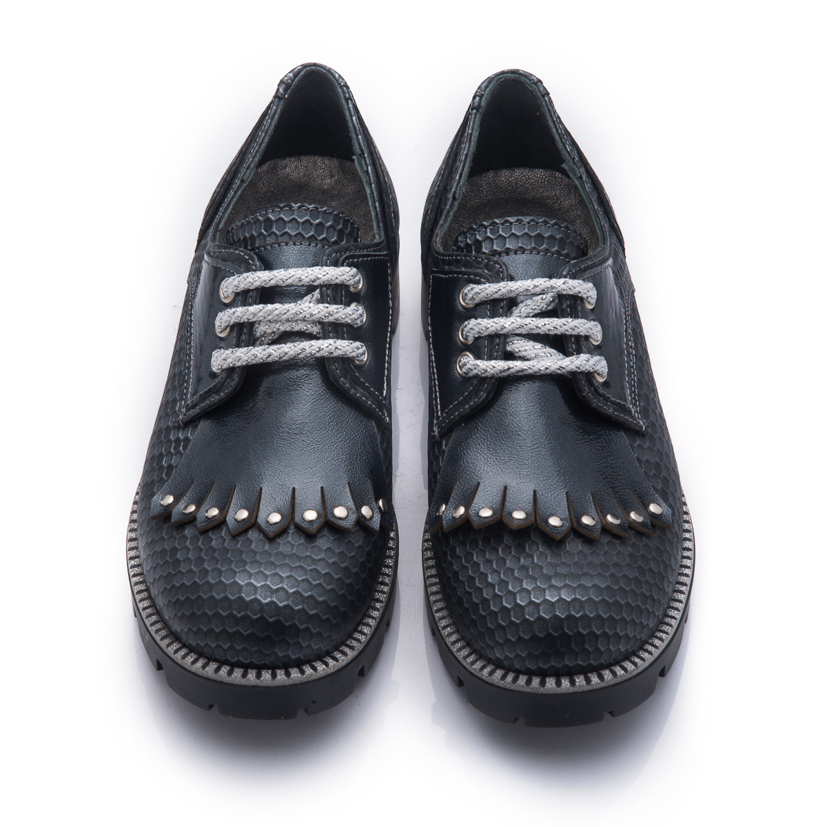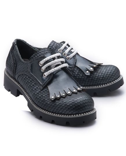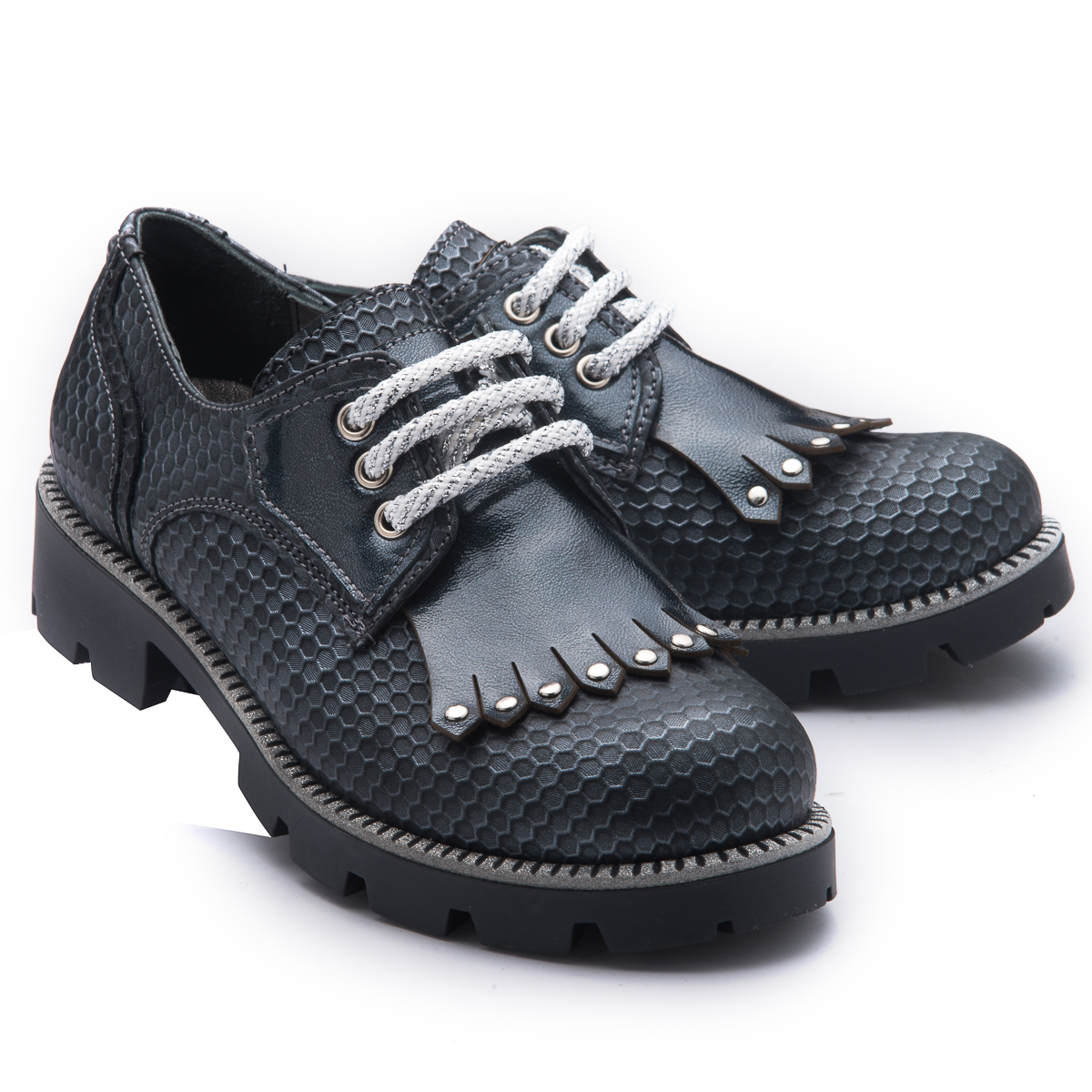 Туфлі-оксфорди для дівчинки – це ідеальний вибір для шкільних буднів. Виготовлені з високоякісної натуральної шкіри сірого кольору.  Класичний дизайн з срібними шнурівками забезпечить надійну фіксацію та елегантний вигляд. Підошва з невеликим каблучком з термопластичної гуми. Устілка шкіряна з анатомічним супінатором. Стильні та зручні, ці оксфорди стануть улюбленою парою взуття вашої дитини.