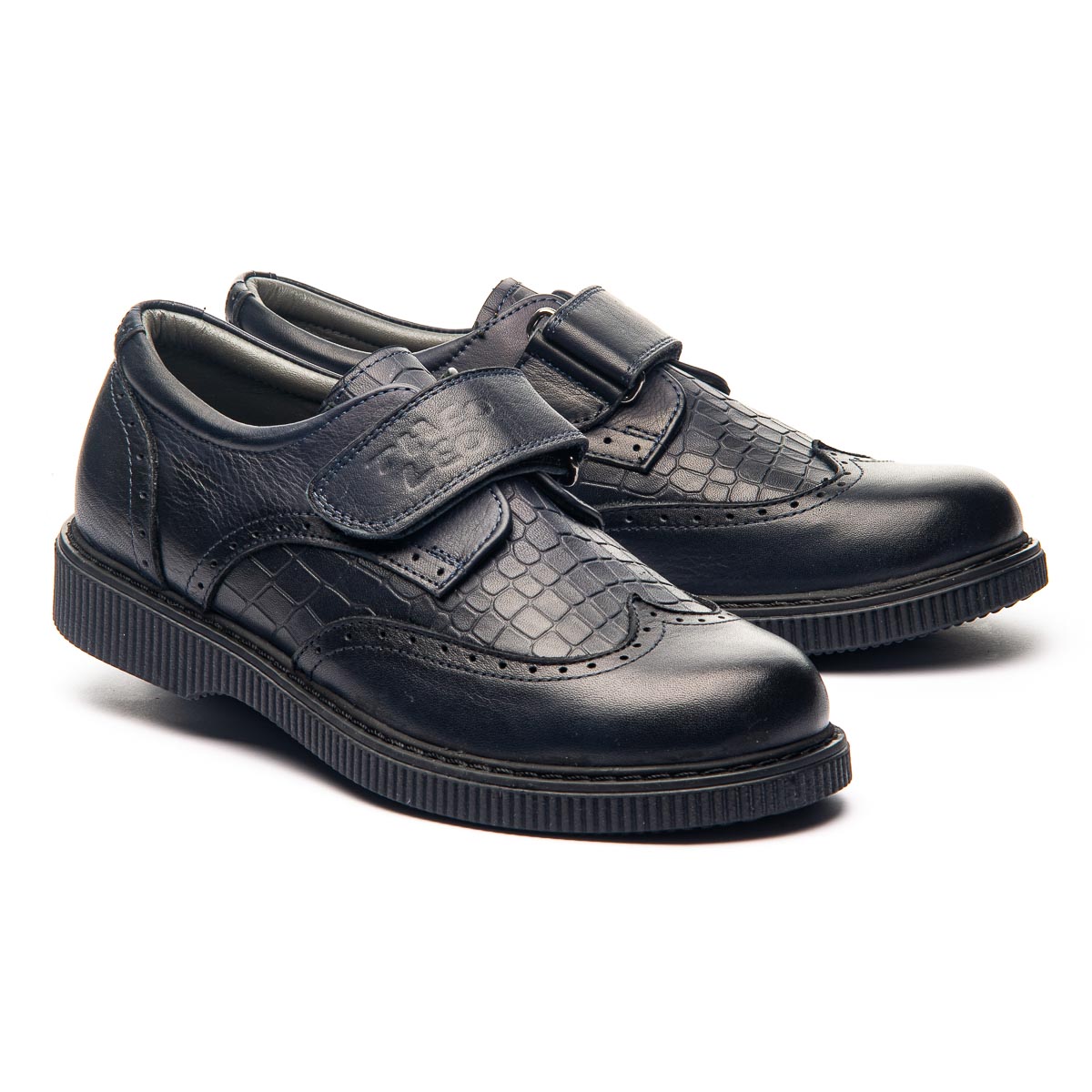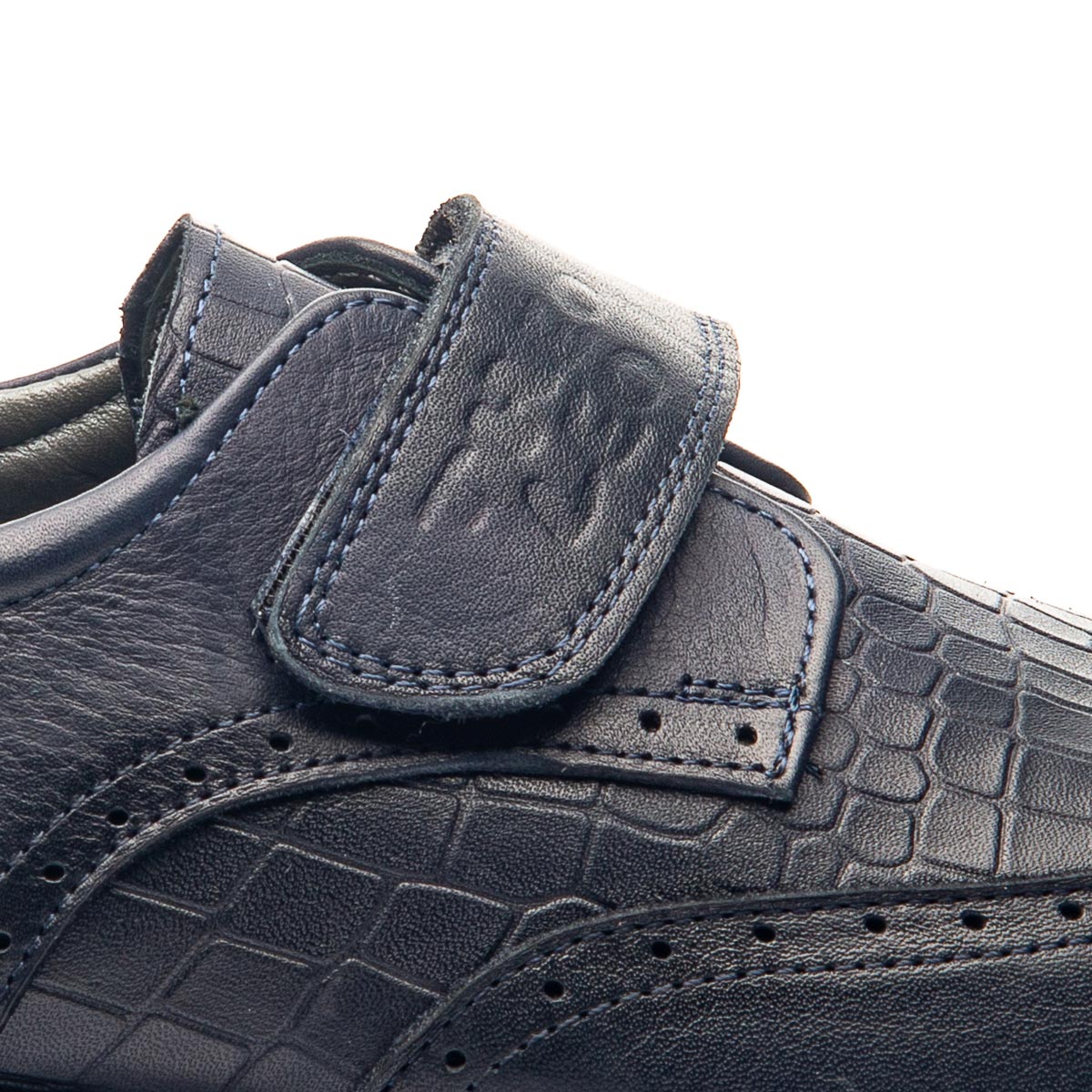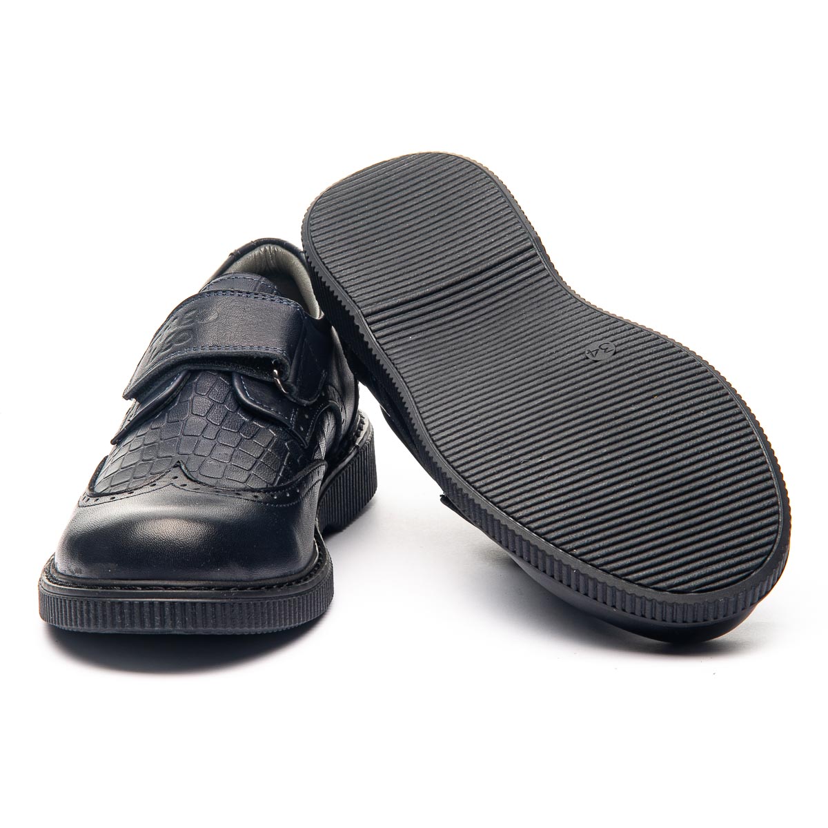 Туфлі для хлопчика, виготовлені з натуральної шкіри в синьому кольорі з додаванням вставок імітуючи крокодилячу шкіру. Замість шнурків використовується липучка, що робить процес взування швидким та комфортним. Підкладка та устілка з анатомічним супінатором виготовлені з натуральної шкіри, що сприяє правильному формуванню стопи. Комфортна підошва з термопластичної гуми. Туфлі зручні для дітей та ідеальні для школи.