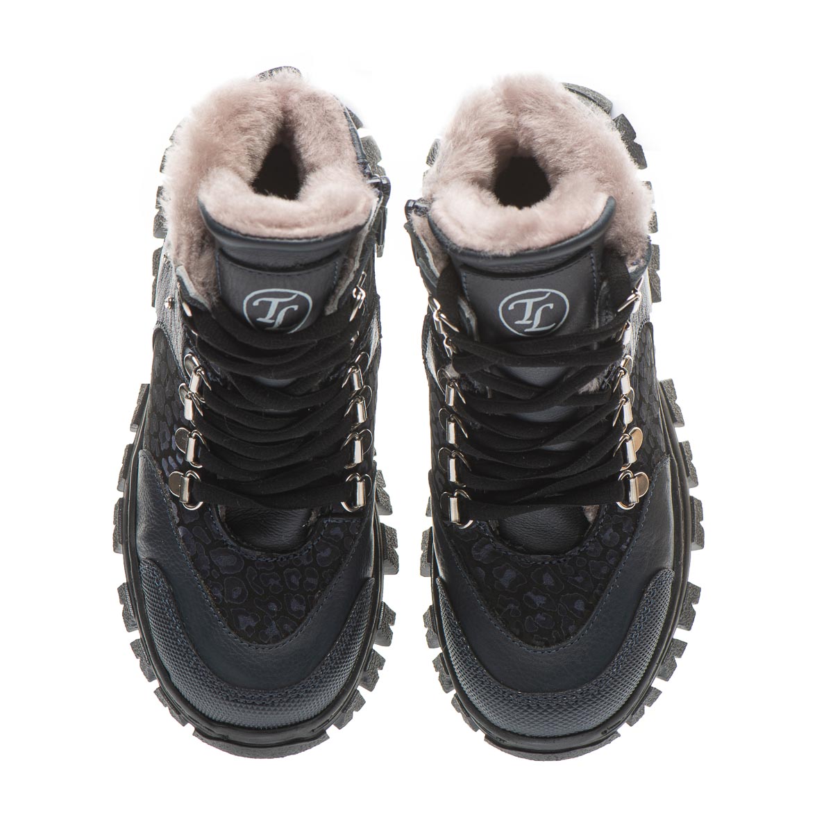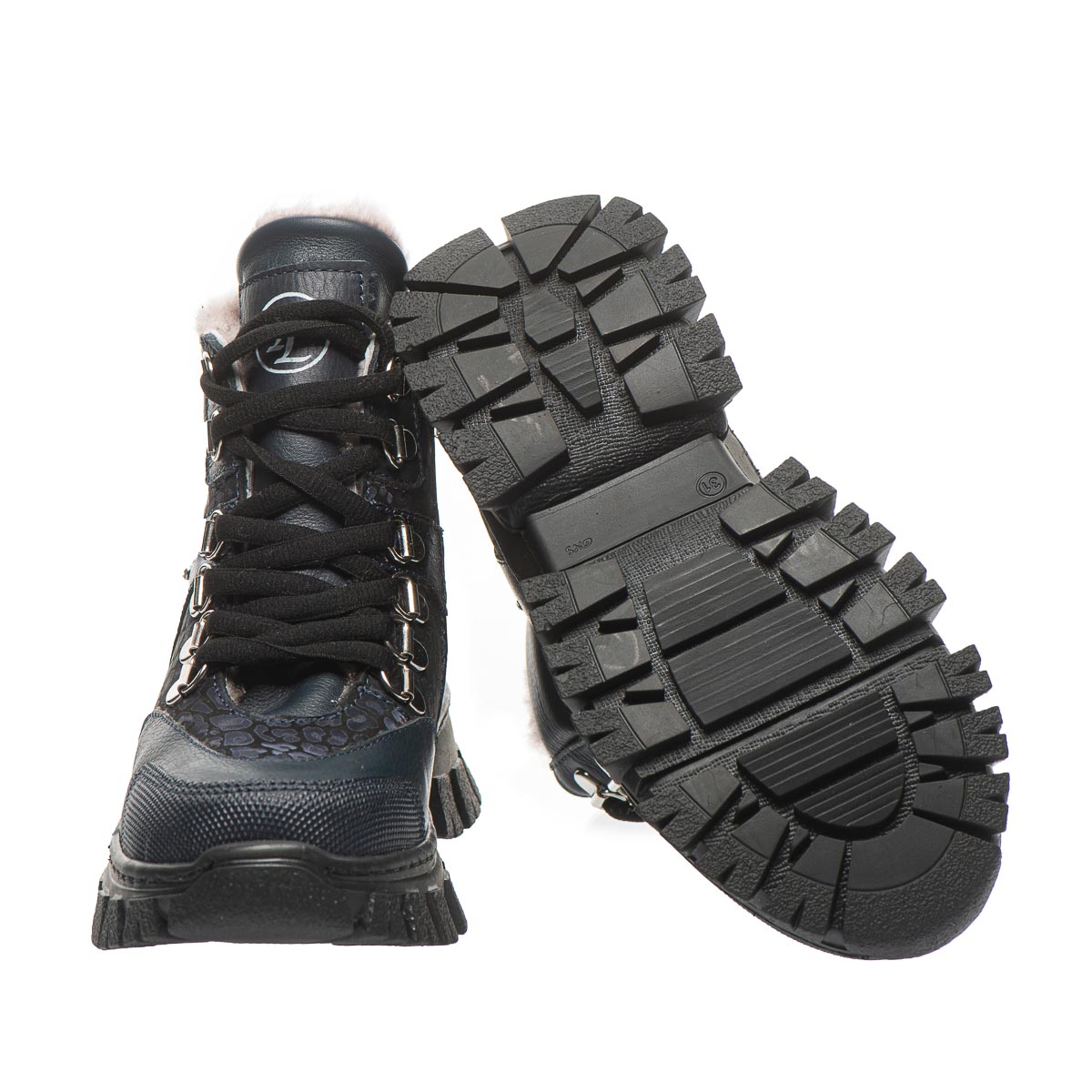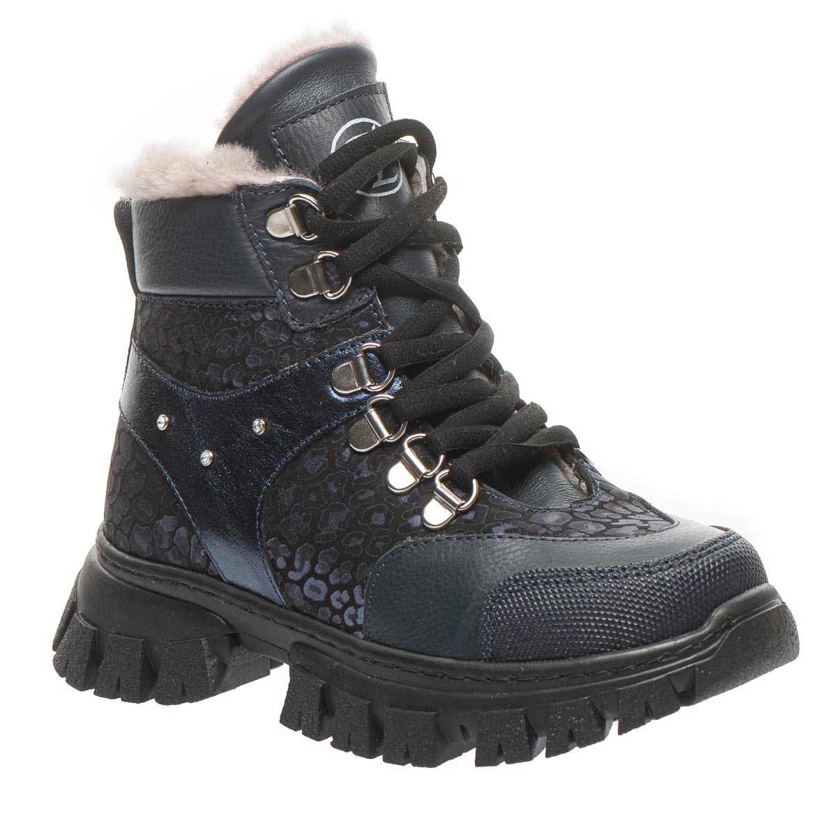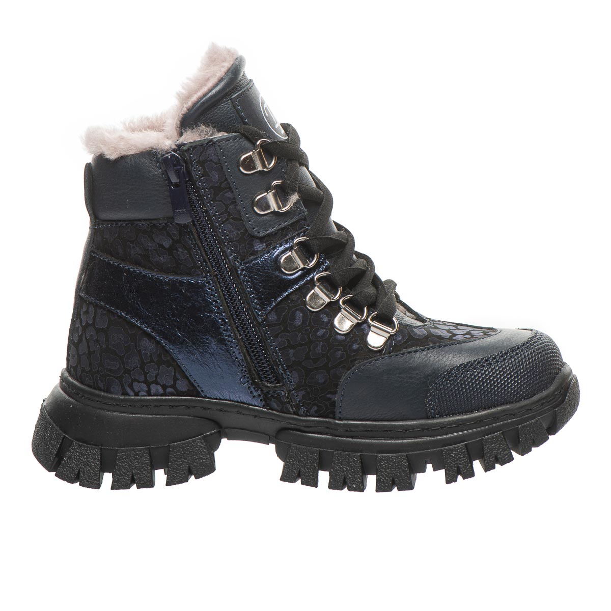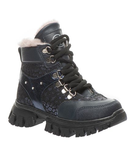 Стильна новинка з колекції – зимові черевики для дівчаток, виготовлені з натуральної шкіри та синього нубуку. Ефектний дизайн із тваринним принтом, прикрашений заклепками та декоративними металевими петлями для шнурків, додасть оригінальності образу вашої маленької модниці. Черевики утеплені натуральним хутром, устілка має супінатор та забезпечує додатковий комфорт. Міцний задник створюють ідеальну підтримку для дитячих ніжок, а бічна блискавка робить процес взування швидким і легким. Ця пара стане улюбленою у зимовий період та забезпечить комфорт під час морозів.