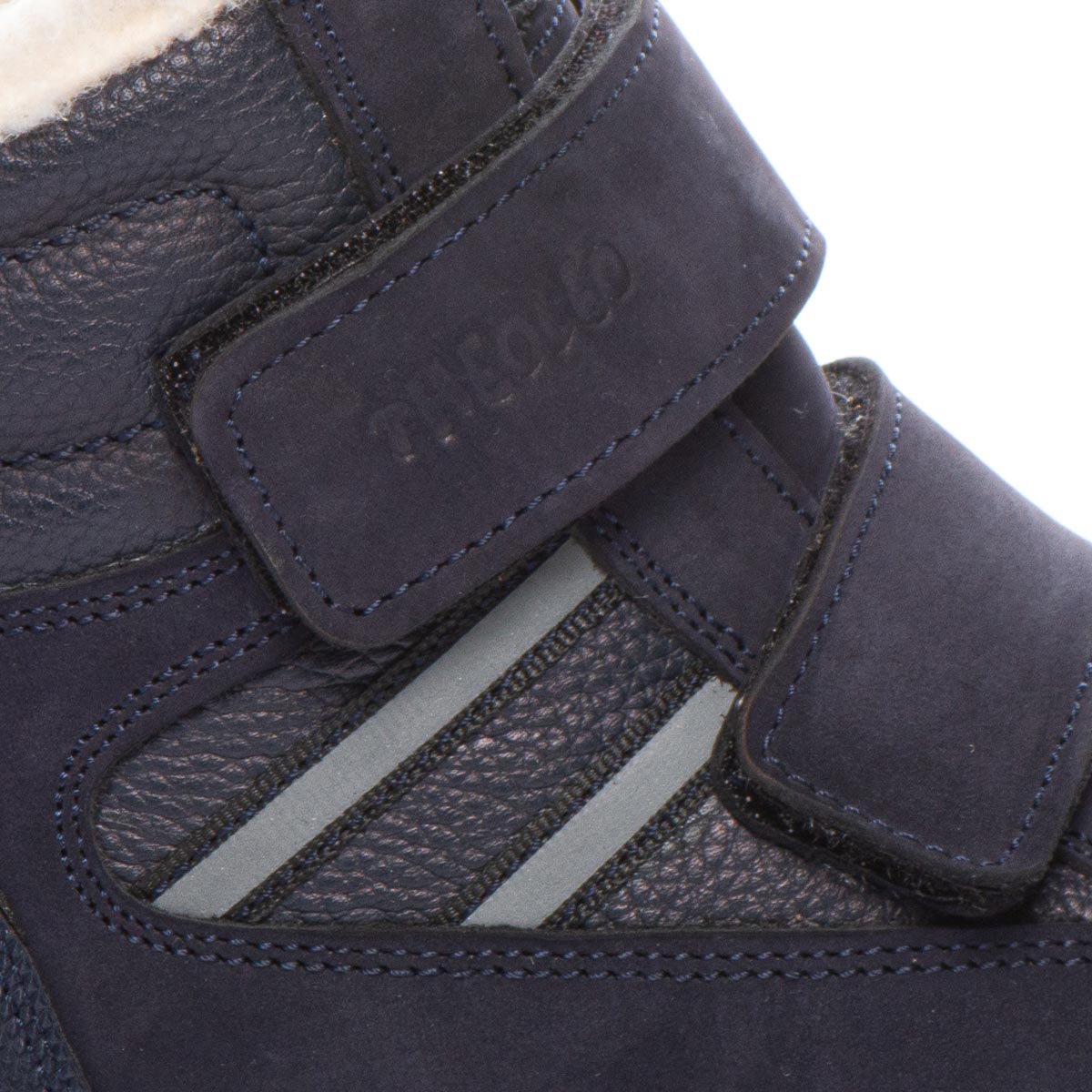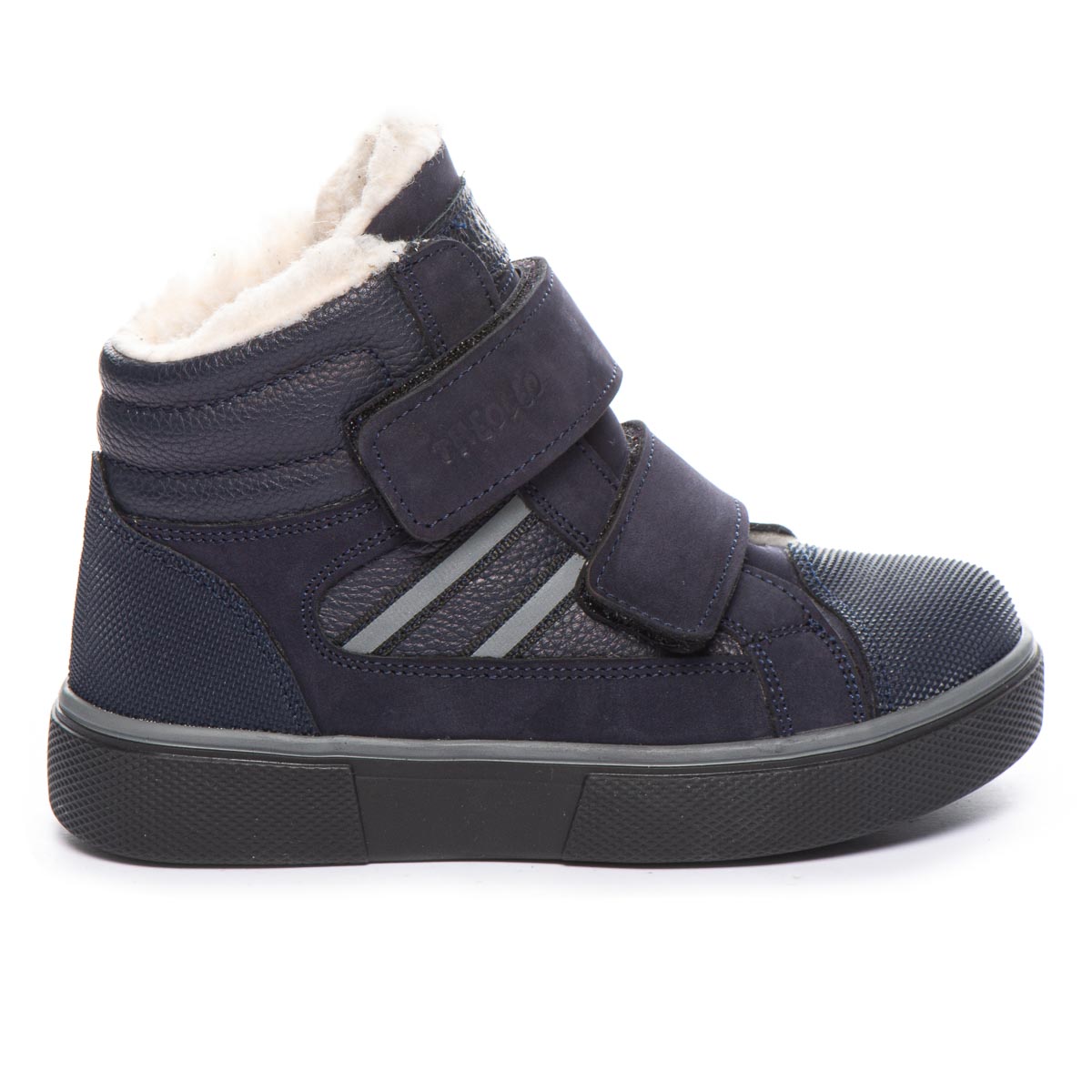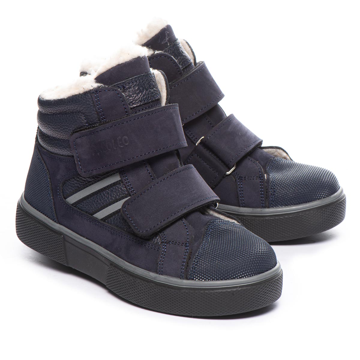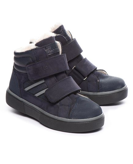 Зимові черевики для хлопчиків виготовлені з натуральної шкіри та нубуку темно-синього кольору, мають внутрішнє утеплення з вовни. Вони забезпечені захистом від ударів і подряпин на носку та п'яті, а також оснащені світловідбивними елементами для підвищення безпеки. Підошва виготовлена з високоякісної термопластичної гуми. Надійна фіксація на нозі забезпечується застібками-липучками, а жорсткий задник і устілки з анатомічним супінатором створюють додатковий комфорт. Усе це надає черевикам унікального дизайну.