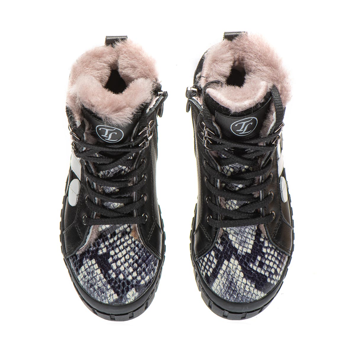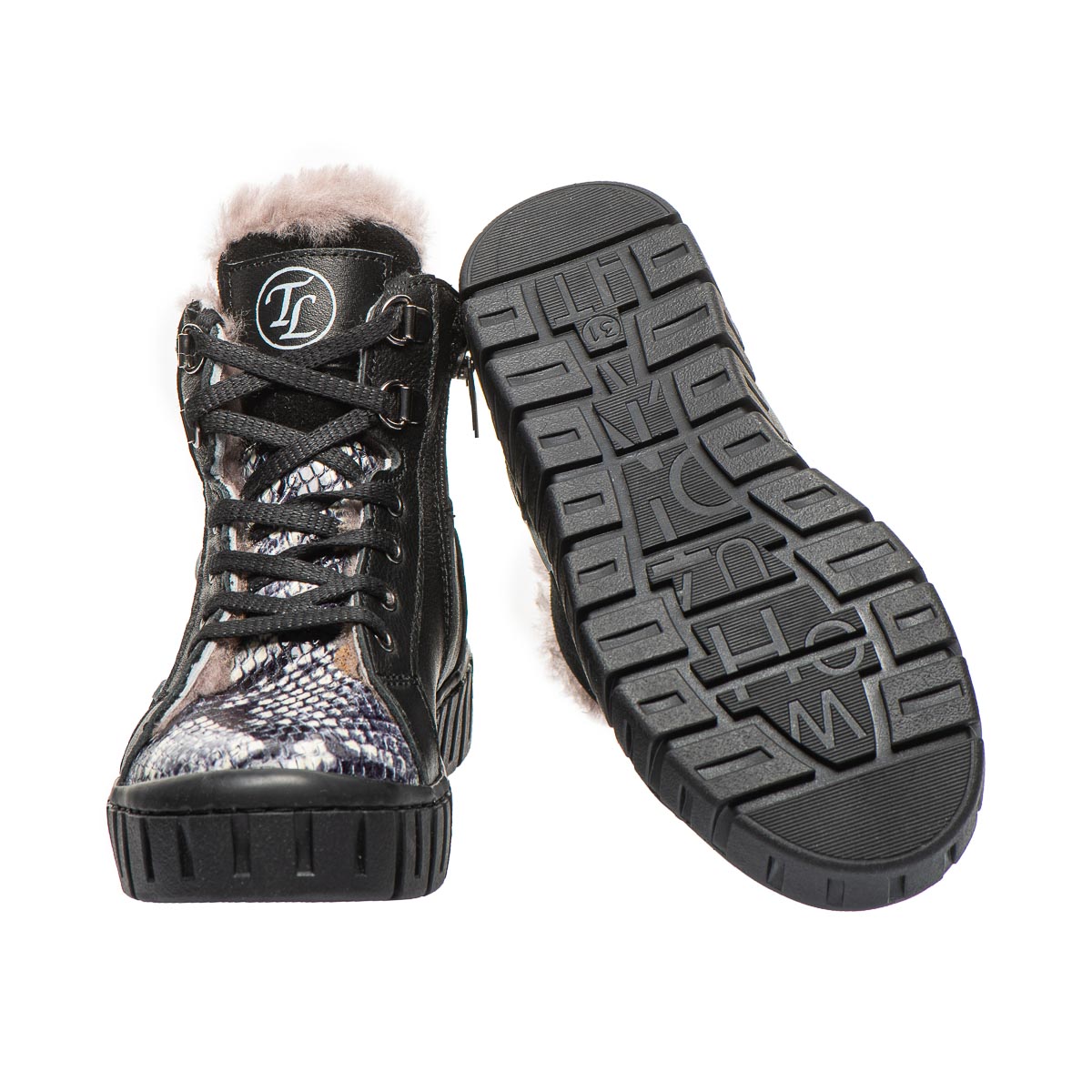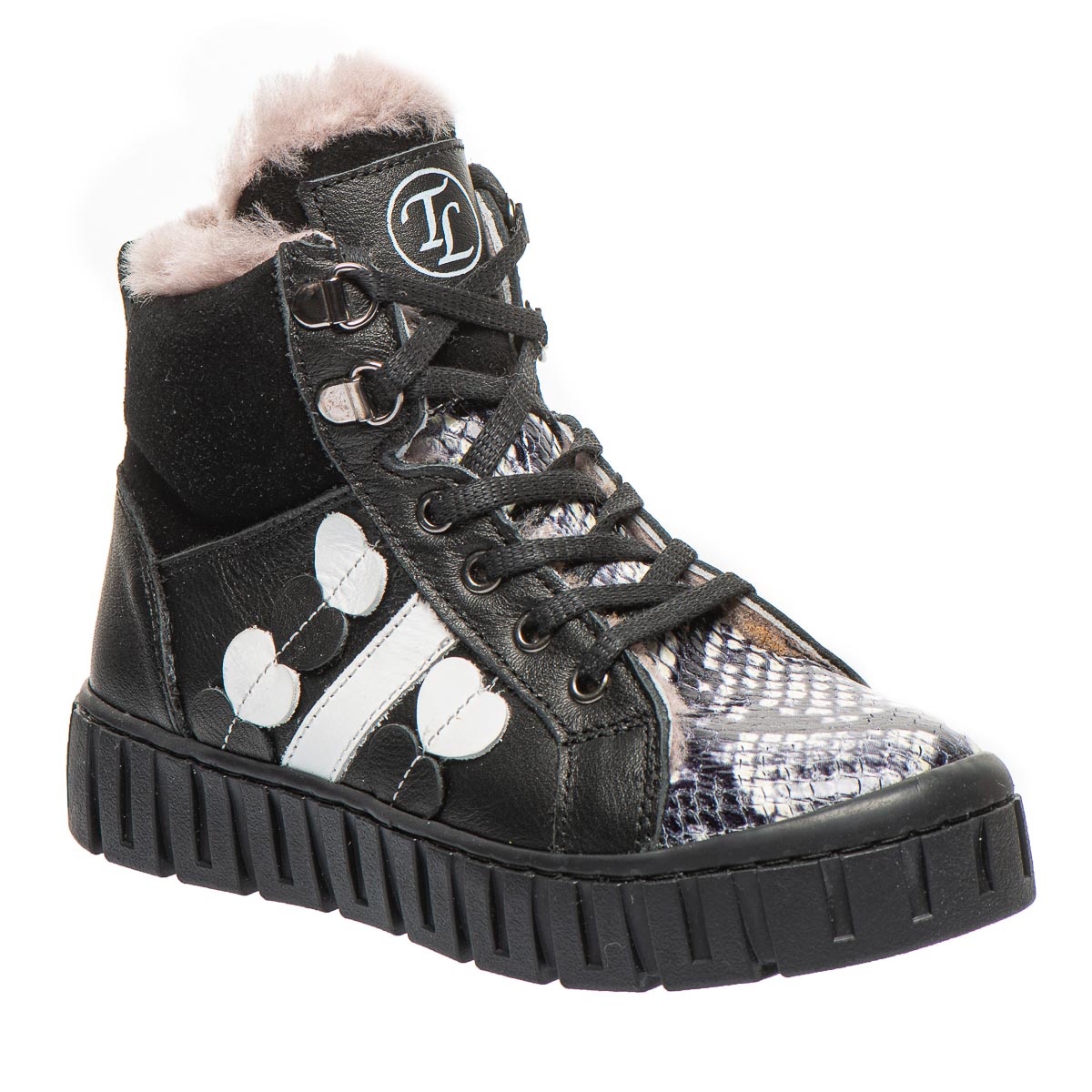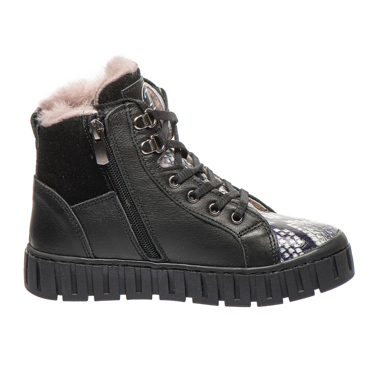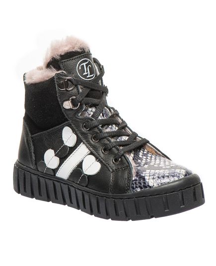 Зимові черевики для дівчинки – ідеальний вибір для юних модниць! Виготовлені з натуральної шкіри чорного кольору, вони відрізняються стильним дизайном завдяки біло-чорній вставці, що імітує зміїну шкіру. Утеплені натуральним хутром. Зручна підошва та устілка з супінатором підвищують комфорт під час носіння. Модель поєднує два типи застібання – бокову блискавку та шнурівку. Ідеально підходять для активних дівчат, які хочуть поєднувати стильний вигляд із комфортом!